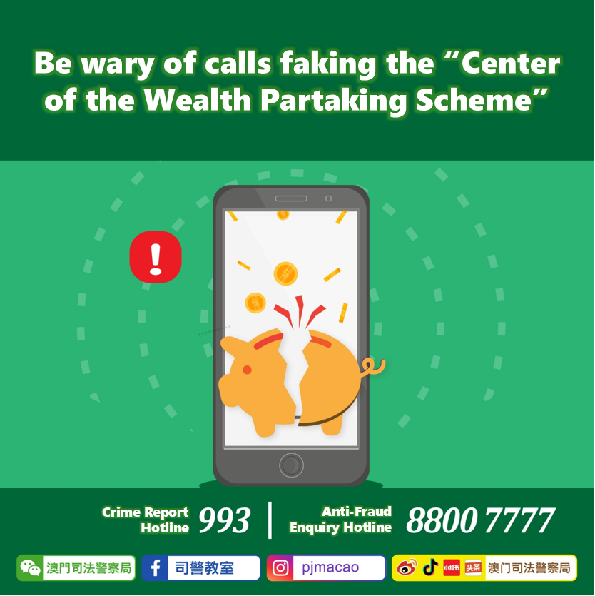 The Judiciary Police (PJ) has received multiple reports from residents who have received calls from individuals impersonating the "Center for the Wealth Partaking Scheme." Using recordings in both Cantonese and Mandarin, the swindlers claimed that the recipient's eligibility for the "Wealth Partaking Scheme" had been revoked. The recipients were instructed to follow the prompts in the recording to obtain more information.