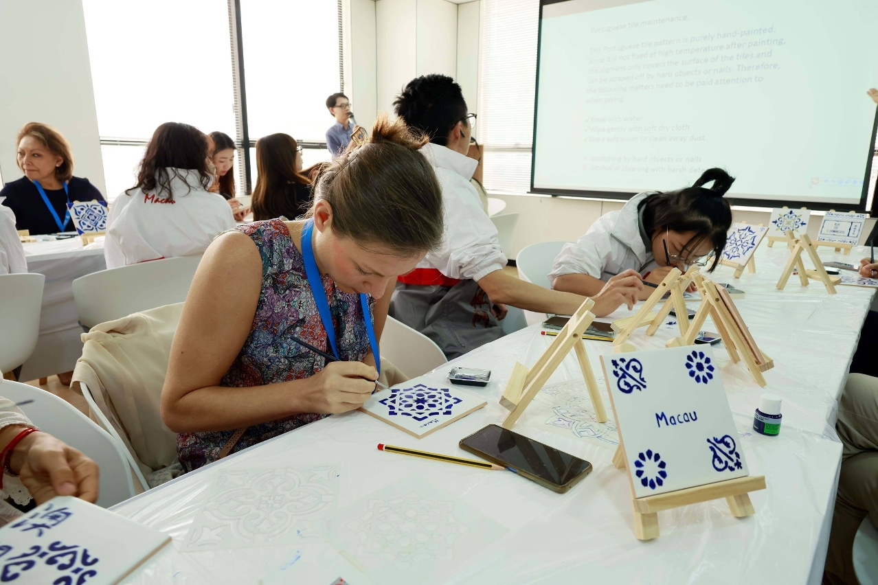 Yesterday (May 17) afternoon, on the sidelines of the summit, there were two educational experiences related to Macao’s east-meets-west heritage for delegates: a workshop to learn how to bake Portuguese egg tarts and the Macanese Genete cookies, and a Portuguese blue tile painting workshop to instruct participants to try their hand at the art which can be found in churches and other sites around town.