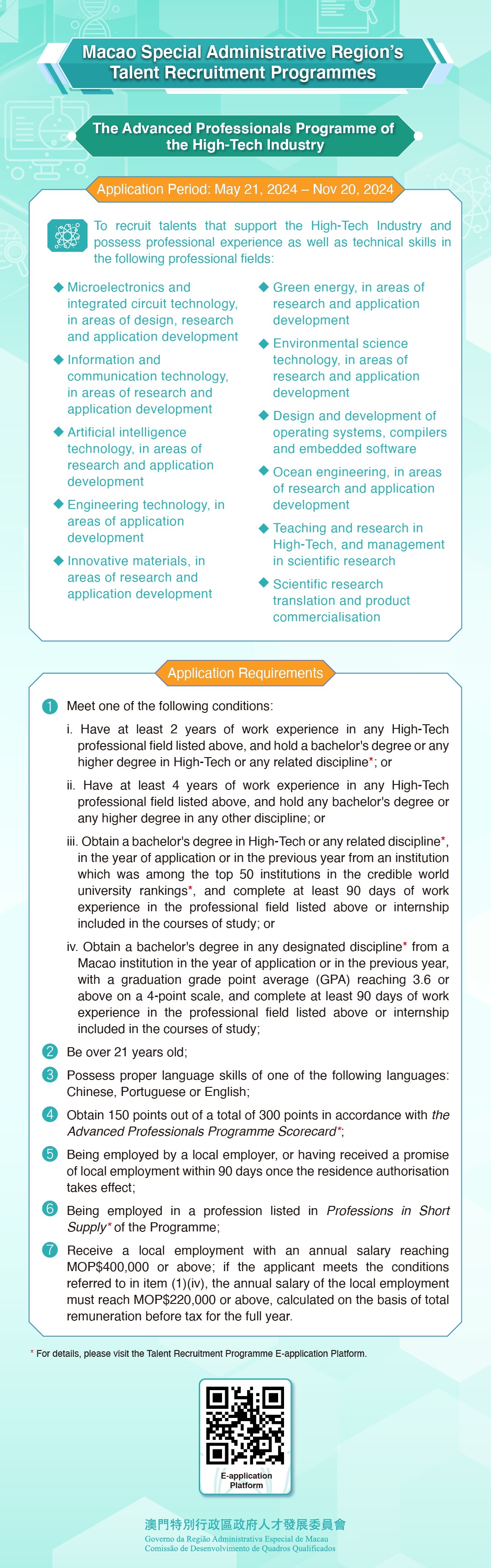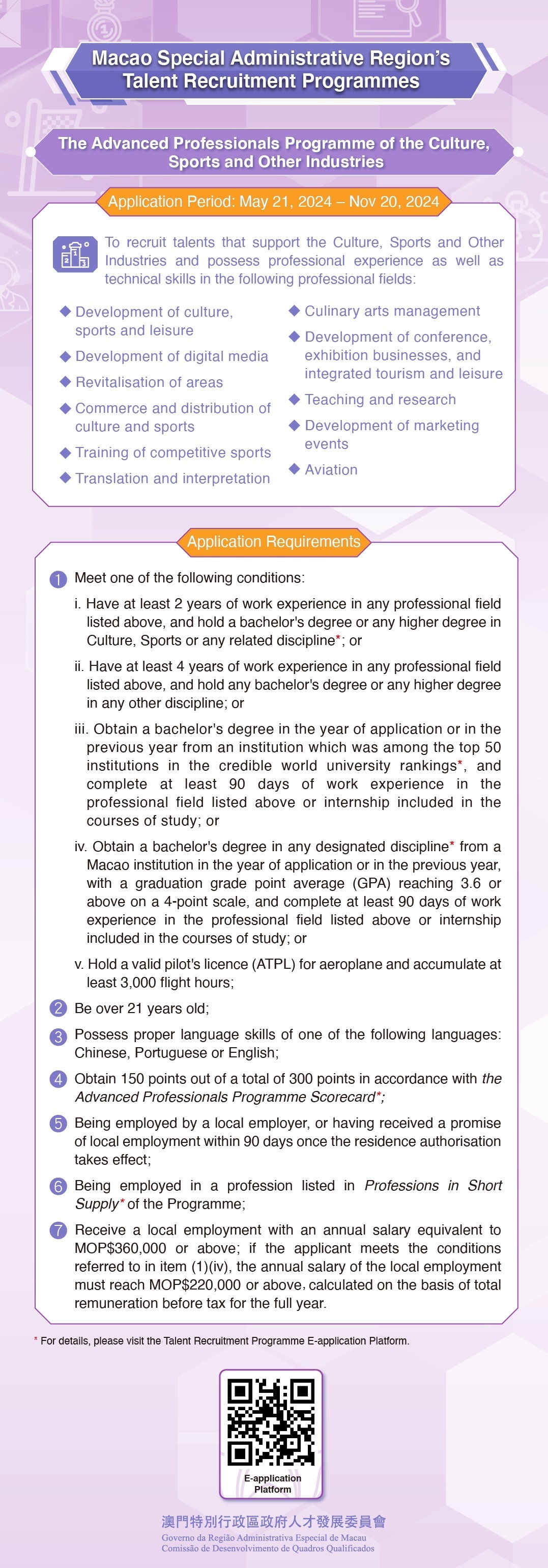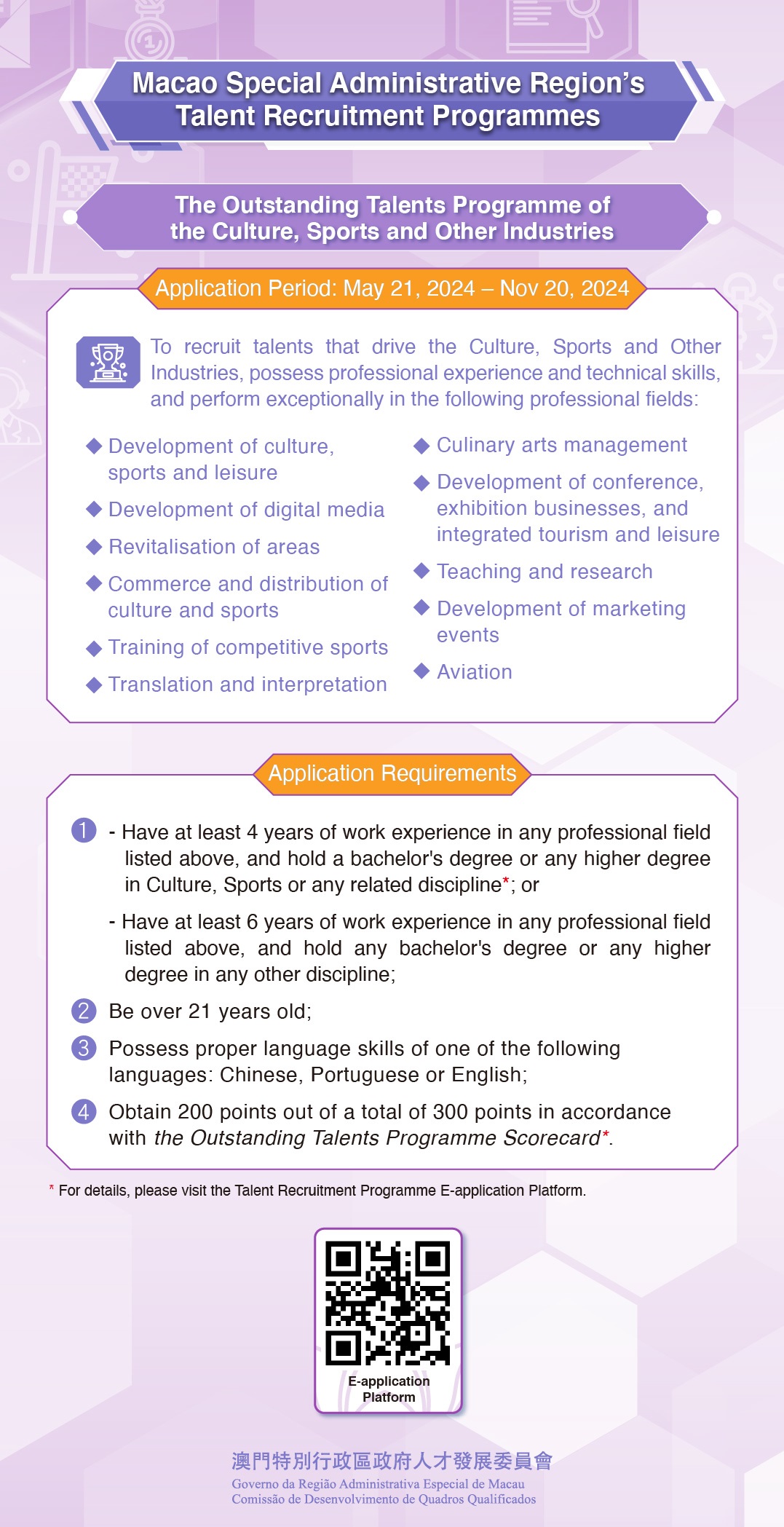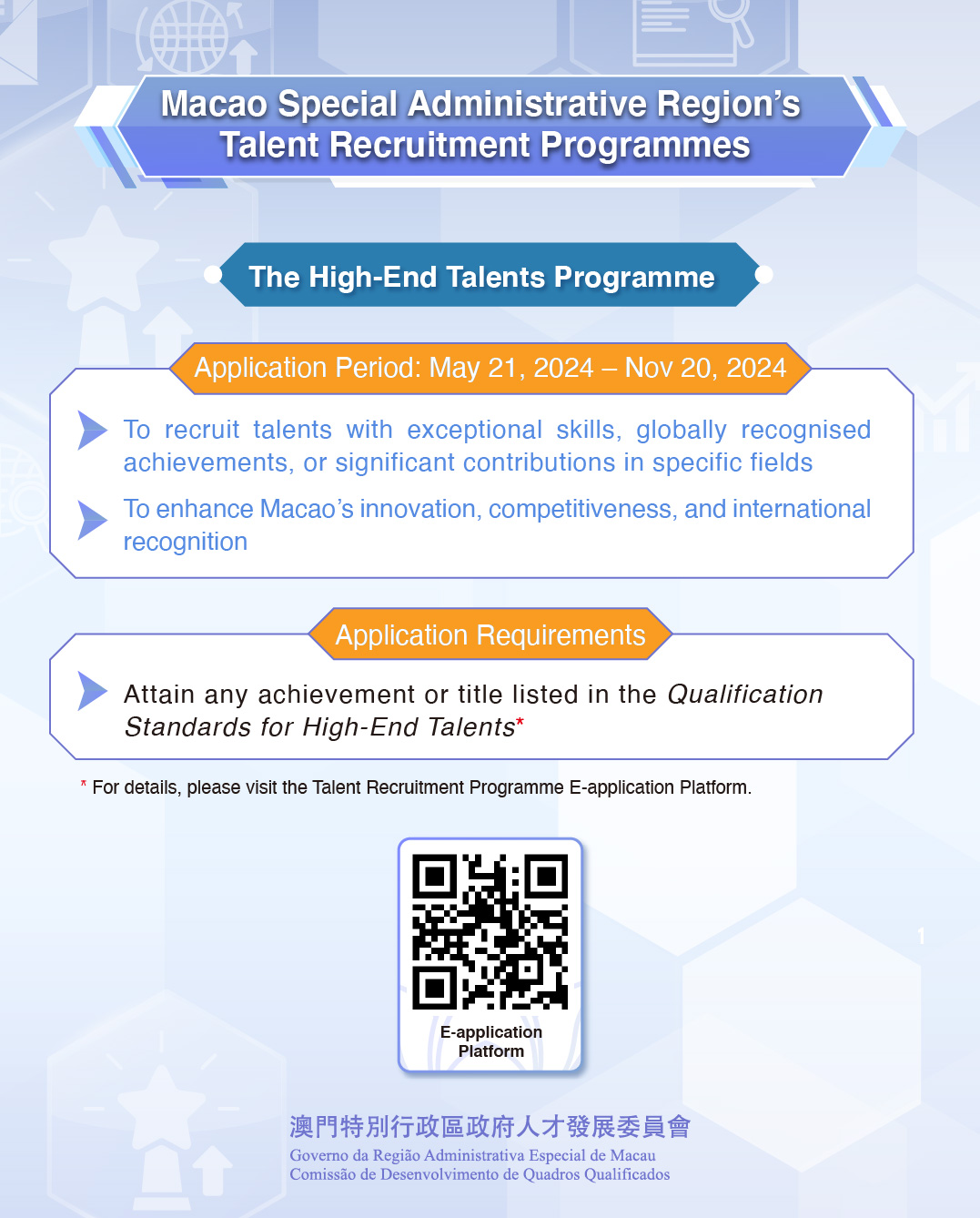 To facilitate the "1+4" strategy for the development of adequate economic diversification as well as further support local industries and sustainable social development, the Government of the Macao Special Administrative Region (SAR) launches its new round of talent recruitment programmes from May 21 to November 20, 2024. The 9 programmes include the High-end Talents Programme, the Outstanding Talents Programmes and the Advanced Professionals Programmes for the Big Health Industry, the High-Tech Industry, the Modern Finance Industry, as well as the Culture, Sports and Others Industries.