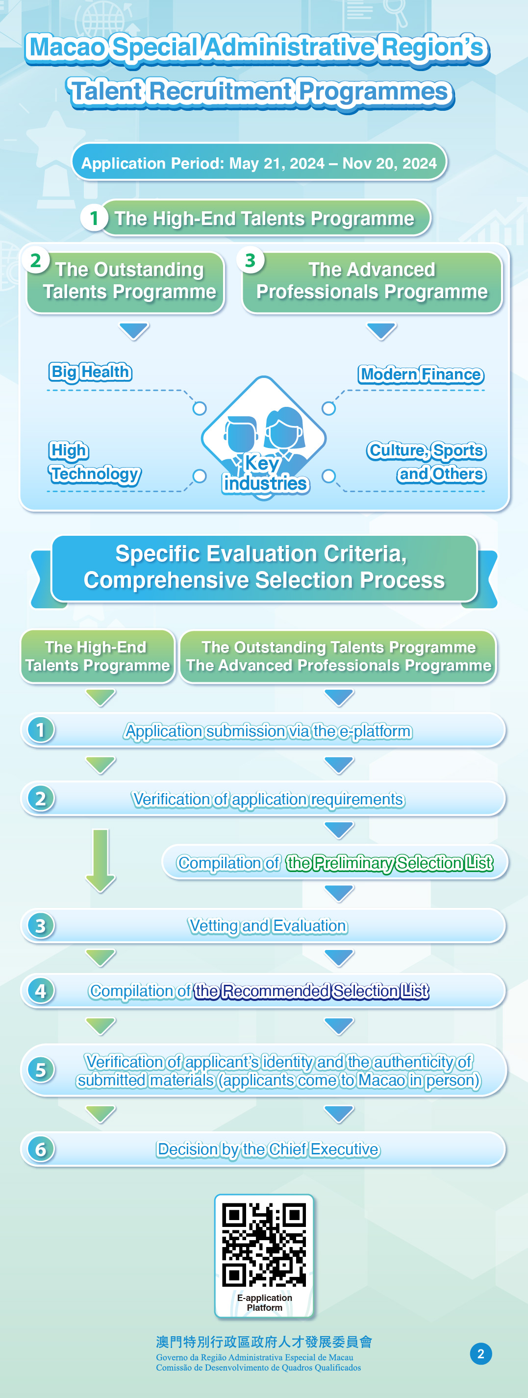 The competent entities for the Talent Recruitment Programmes will verify the documents and materials submitted by the applicants according to the specific requirements of the applicable talent recruitment programme. Applicants will be evaluated based on their contributions to enhancing innovation, competitiveness, international recognition, or promoting diversified economic development of the Macao SAR. The professional knowledge, qualifications, or experience possessed by the applicants pertaining to the professional sectors will also be considered as a priority during the evaluation process. The Talent Recruitment System follows a rigorous vetting and reviewing process with each application undergoing a multi-layered monitoring system. Different collaborative competent entities and government departments will ensure that the applicants meet the requirements and evaluation criteria of the relevant programmes, and that the recruited talents are capable in supporting the economic and social development of the Macao SAR.