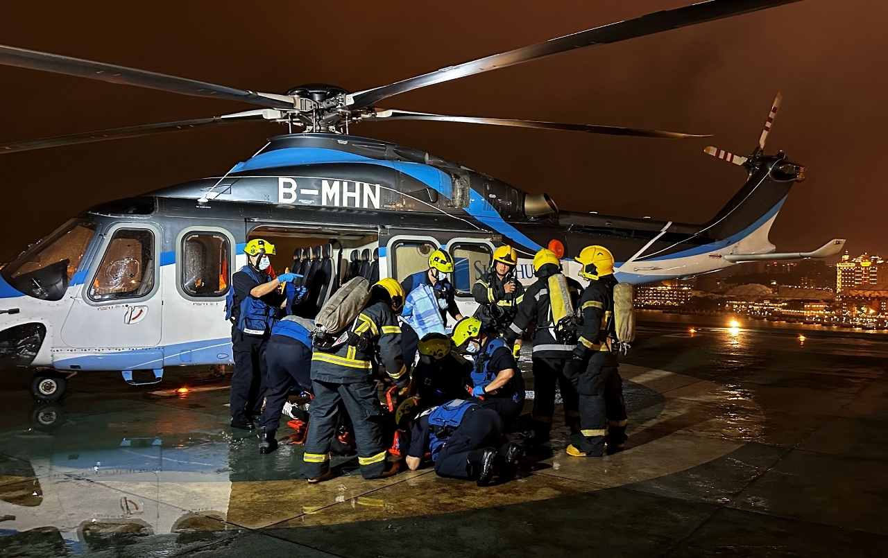 The exercise simulated the accident of a helicopter carrying 2 crew members and 2 passengers. Shortly after taking off from the Macau Outer Harbour Heliport, the helicopter encountered a tail rotor drive failure, resulting in a forced heavy landing on the main pad, with some components detached from the aircraft and scattered on the ground. The 2 crew members were uninjured, but the 2 passengers suffered from severe injuries.