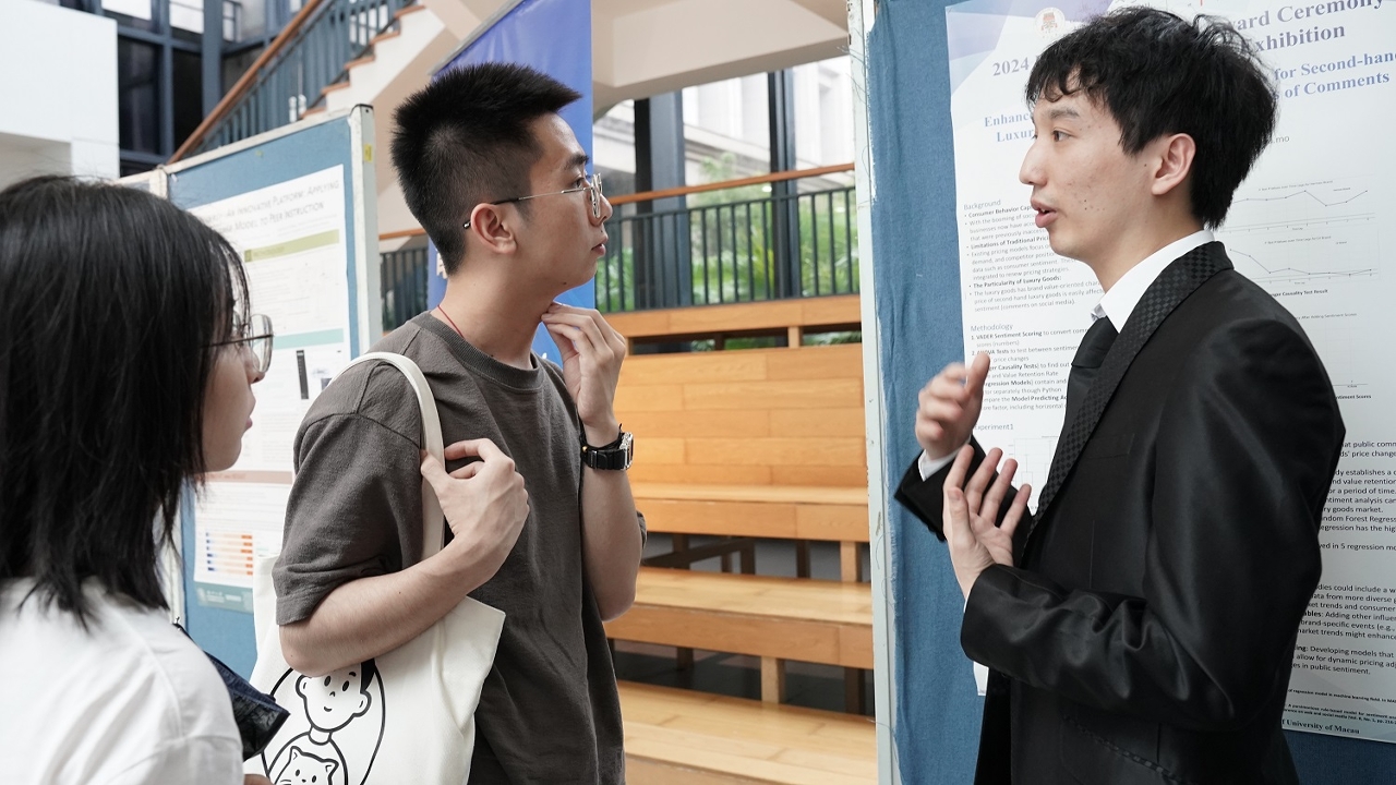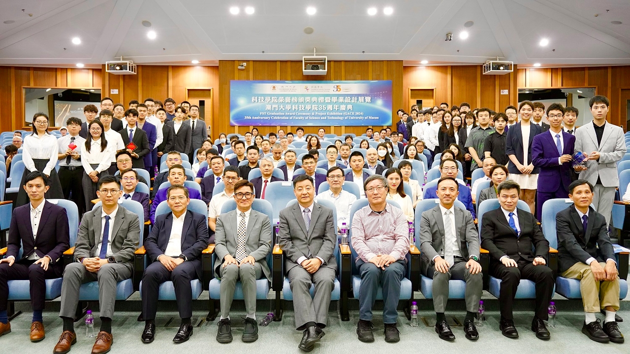The Faculty of Science and Technology (FST) of the University of Macau (UM) held the FST Graduation Award Ceremony & Project Exhibition today (24 May) as part of the faculty’s 35th anniversary celebration. The exhibition showcased a total of 50 graduation projects and results by FST undergraduate and postgraduate students, covering a wide range of areas from basic sciences to cutting-edge technologies. More than 100 industry representatives, business executives, government officials, professors and students from the Guangdong-Hong Kong-Macao Greater Bay Area (GBA) visited the exhibition. Many industry representatives from the GBA gave recognition to the work of UM students.