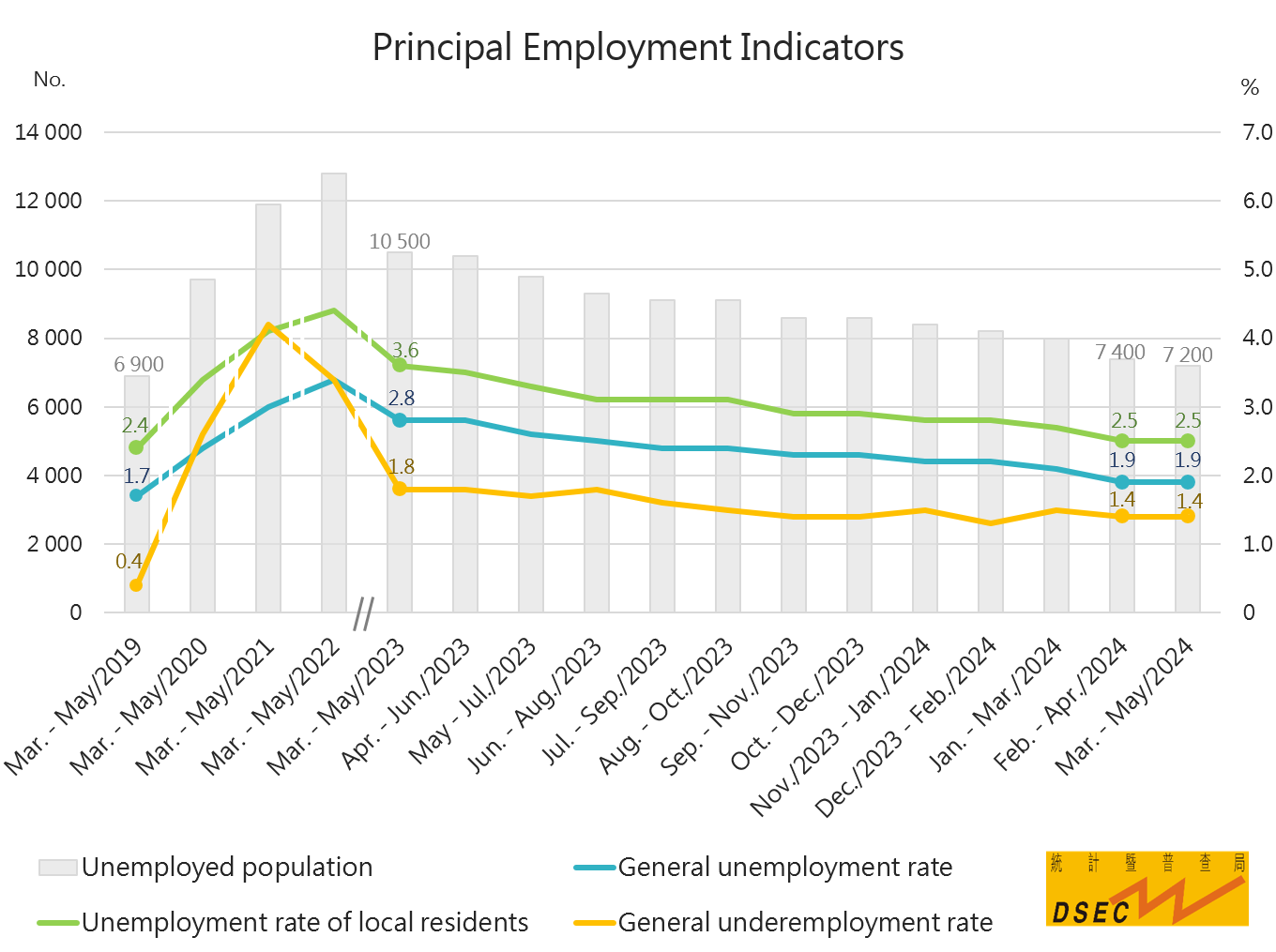 Information from the Statistics and Census Service (DSEC) indicated that both the general unemployment rate (1.9%) and the unemployment rate of local residents (2.5%) for March - May 2024 held steady from the previous period (February - April 2024) after falling for two consecutive periods. Both indicators approached their corresponding levels in the same period in 2019. In addition, the underemployment rate remained unchanged at 1.4%.