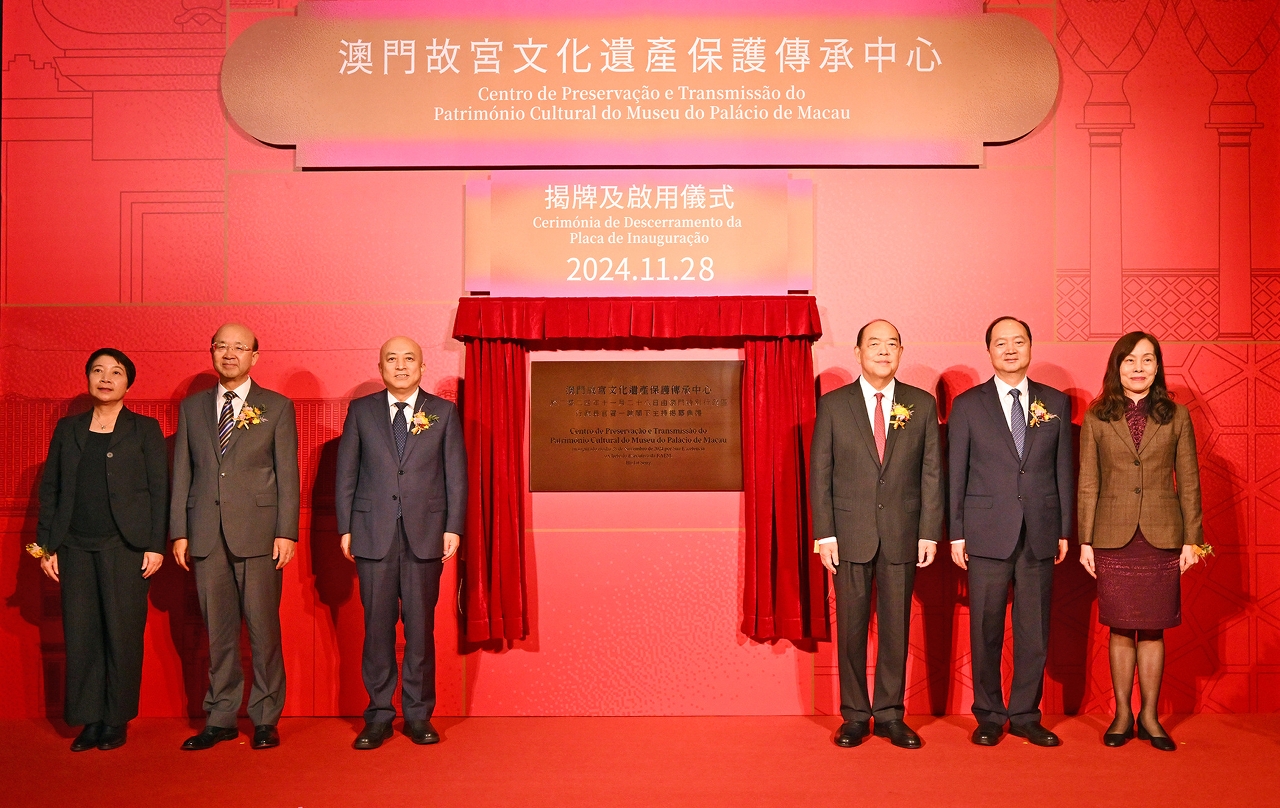 In order to celebrate the 75th anniversary of the founding of the People’s Republic of China and the 25th anniversary of the establishment of the Macao SAR, as well as to strengthen the preservation, restoration, education and promotion of cultural heritage in Macao and contribute to the establishment of Macao as “a base for exchange and cooperation with Chinese culture as the mainstream and the coexistence of different cultures”, the Centre of Preservation and Transmission for Cultural Heritage of the Palace Museum in Macao, jointly established by the Macao SAR Government and the Ministry of Culture and Tourism of the People’s Republic of China, was inaugurated today (28 November), with a plaque unveiling ceremony jointly hosted by the Chief Executive of the Macao SAR Government, Ho Iat Seng, and the Director of the Palace Museum, Wang Xudong. The ceremony was also attended by the Director of the Liaison Office of the Central People’s Government in the Macao SAR, Zheng Xinchong; the Commissioner of the Ministry of Foreign Affairs of the People’s Republic of China in the Macao SAR, Liu Xianfa; the Secretary for Social Affairs and Culture of the Macao SAR Government, Ao Ieong U; and the President of the Cultural Affairs Bureau of the Macao SAR Government, Leong Wai Man.