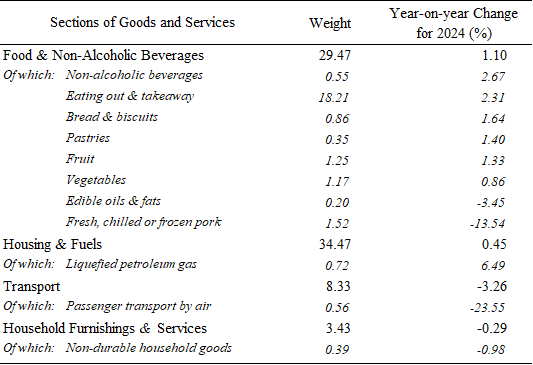 With respect to the sections of goods and services that are closely linked to livelihoods, the price index of Food & Non-Alcoholic Beverages (weight: 29.47) increased by 1.1% year-on-year in 2024, with growth recorded in the price indices of non-alcoholic beverages (+2.67%), eating out & takeaway (+2.31%), bread & biscuits (+1.64%), pastries (+1.4%), fruit (+1.33%) and vegetables (+0.86%). However, these price increases had limited impact on the price index of Food & Non-Alcoholic Beverages because, except for eating out & takeaway (weight: 18.21), the weights of non-alcoholic beverages (0.55), bread & biscuits (0.86), pastries (0.35), fruit (1.25) and vegetables (1.17) were relatively low. The price indices of fresh, chilled or frozen pork (weight: 1.52) and edible oils & fats (weight: 0.2), on the other hand, showed respective decreases of 13.54% and 3.45%, which offset part of the increase. Meanwhile, the price index of Housing & Fuels (weight: 34.47) went up by 0.45% year-on-year, with that of liquefied petroleum gas (weight: 0.72) rising by 6.49%.