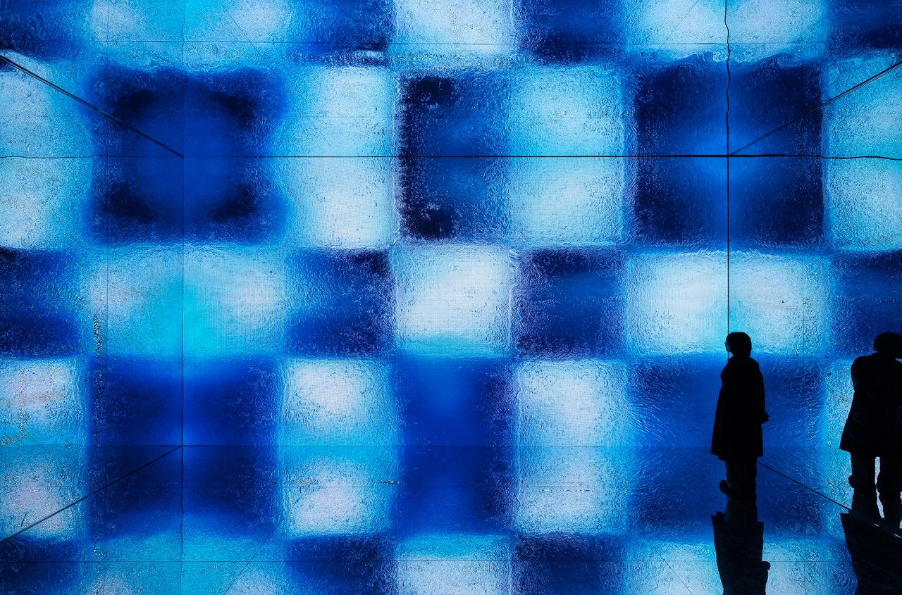 ‘Icy Fire’ is a digital ink generative video art installation measuring 7.5 metres by 4 metres by 4.8 metres. It consists of a high definition LED panel and multiple mirrored walls, ceiling and floor. The piece uses digital ink generative video art and AI techniques to depict the melting of glaciers through the splashing of ink and the artistic language of geometric abstraction, with a colour gradient shifting from cold to warm. The installation combines sound, light, and immersive settings to allow audiences to experience and appreciate the innovation and development of Chinese ink art in the digital and AI era.