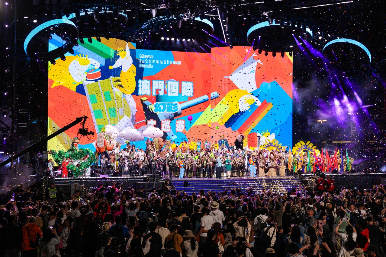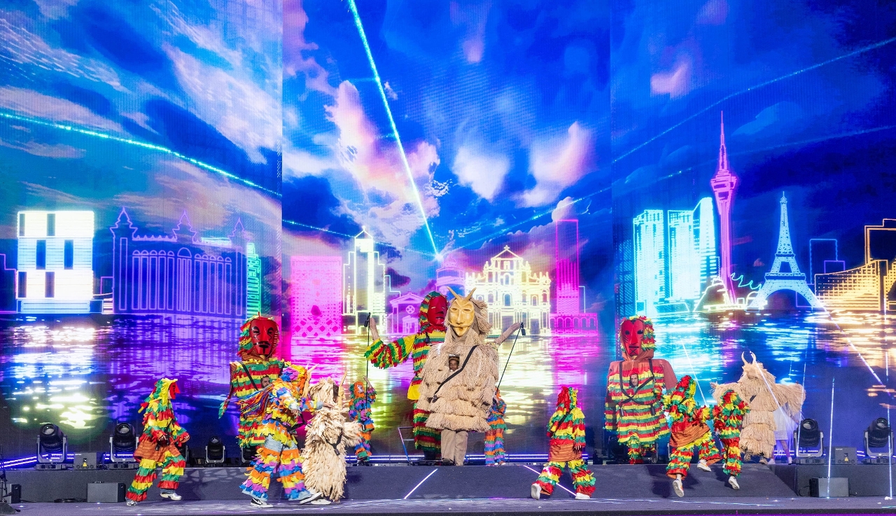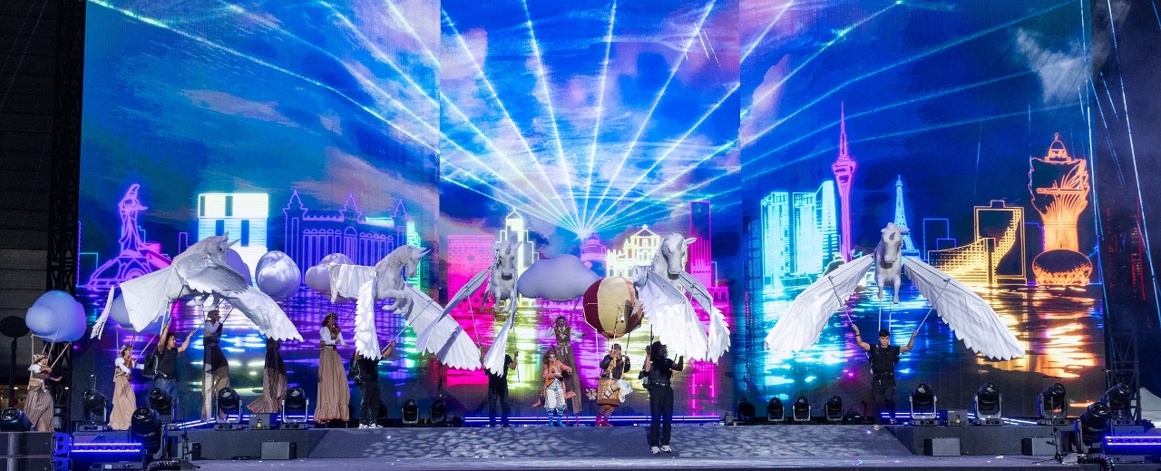 The finale performance tells the story of the parade’s mascot, VIVA, who travels across time and space and returns after a fantastic journey to the “Culture City of East Asia – Macao, China”, and establishes a bridge for cultural communication, opening a unique chapter of the cultural encounter between East and West. During the journey, Chinese and foreign performing groups from five continents gathered in Macao, showcasing a rich and wide spectrum of cultures worldwide in five sections, including “Colourful Sky (Interplay of Reality and Illusion, Blending East and West)”, “Embracing All Rivers (A Survey of the Ancient and Modern, Gathering Elites)”, “Cloaked in Moonlight (Cutting Through Thorns, Persevering with Strength)”, “Echoing Through the Ages (Radiating Brilliance, A Spectacular Stage)”, and “Celebrating Together in Joy”, presenting the artistic charm of “Culture Cities of East Asia”.