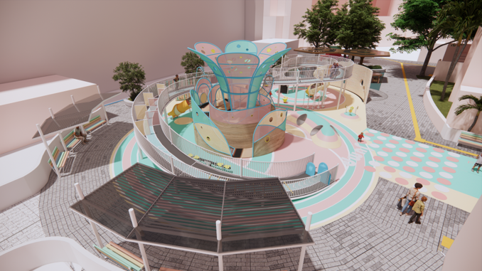 Leisure Area in Bairro Social de Tamagnini Barbosa has an area of about 1,680 square metres. The leisure area is surrounded by several social welfare organisations and centres for the elderly. The venue will be reorganised to create a characteristic leisure area, with the installation of elevated play facilities and play equipment combinations in the shape of flowers to create a high-quality space for both parents and children. At the same time, to accommodate the needs of the elderly and individuals with special needs, the quantity and types of suitable fitness enhancement facilities have been increased, so as to enrich the inclusive experience. Facilities for shelter against the sun and rain have also been added to increase the comfort level of the leisure area.