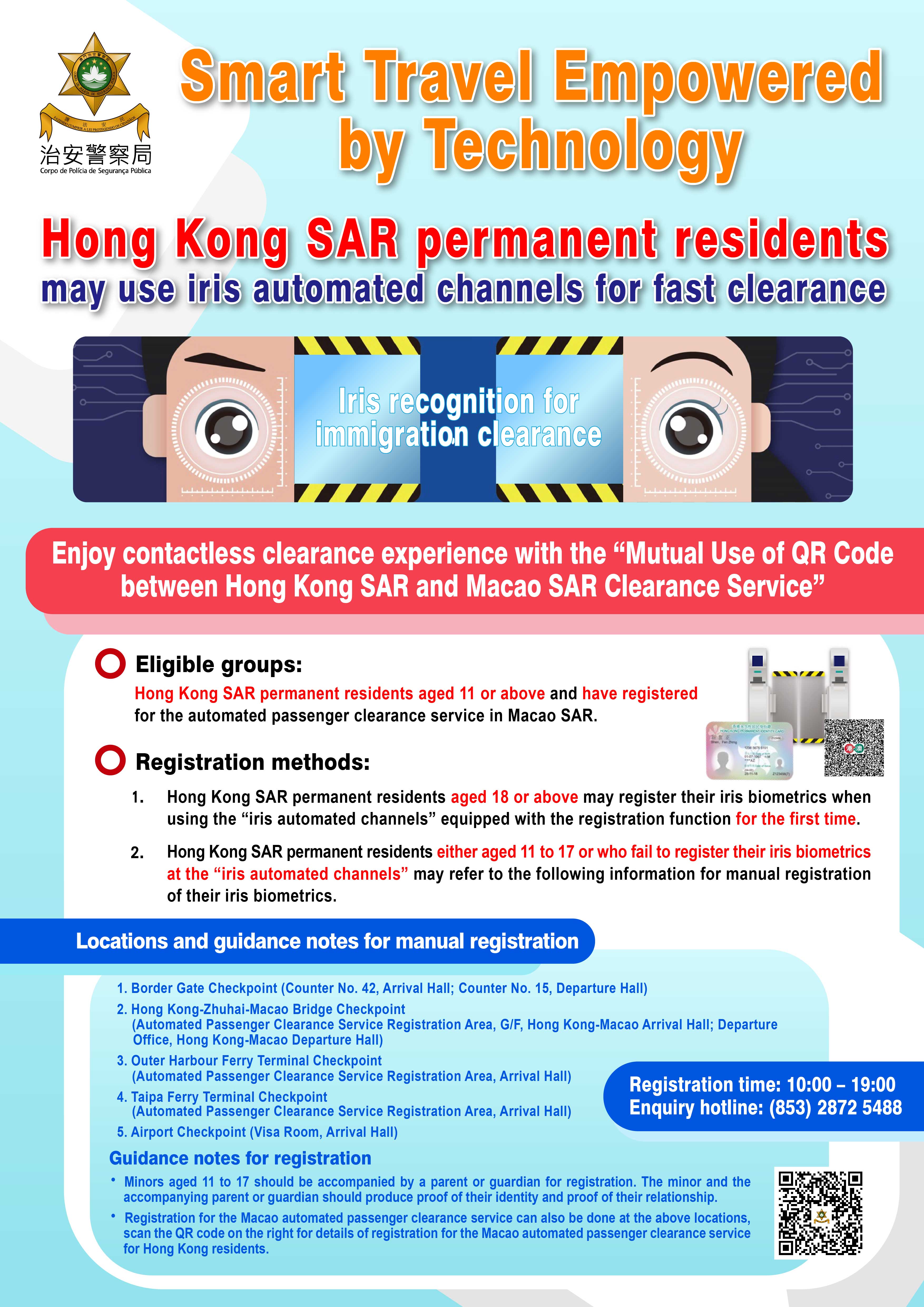 Along with the accelerated development of the Greater Bay Area, the exchange between Hong Kong and Macao residents is becoming increasingly frequent. To further facilitate the Hong Kong residents to travel to Macao, following the successful implementation of the“Mutual Use of QR Code between Hong Kong SAR and Macao SAR Clearance Service” in August last year, the Public Security Police Force is going to extend the eligible groups for using iris recognition for immigration clearance to the Hong Kong SAR permanent residents who have registered for the Macao automated passenger clearance service starting from 12:00 noon on 11 June 2025.
