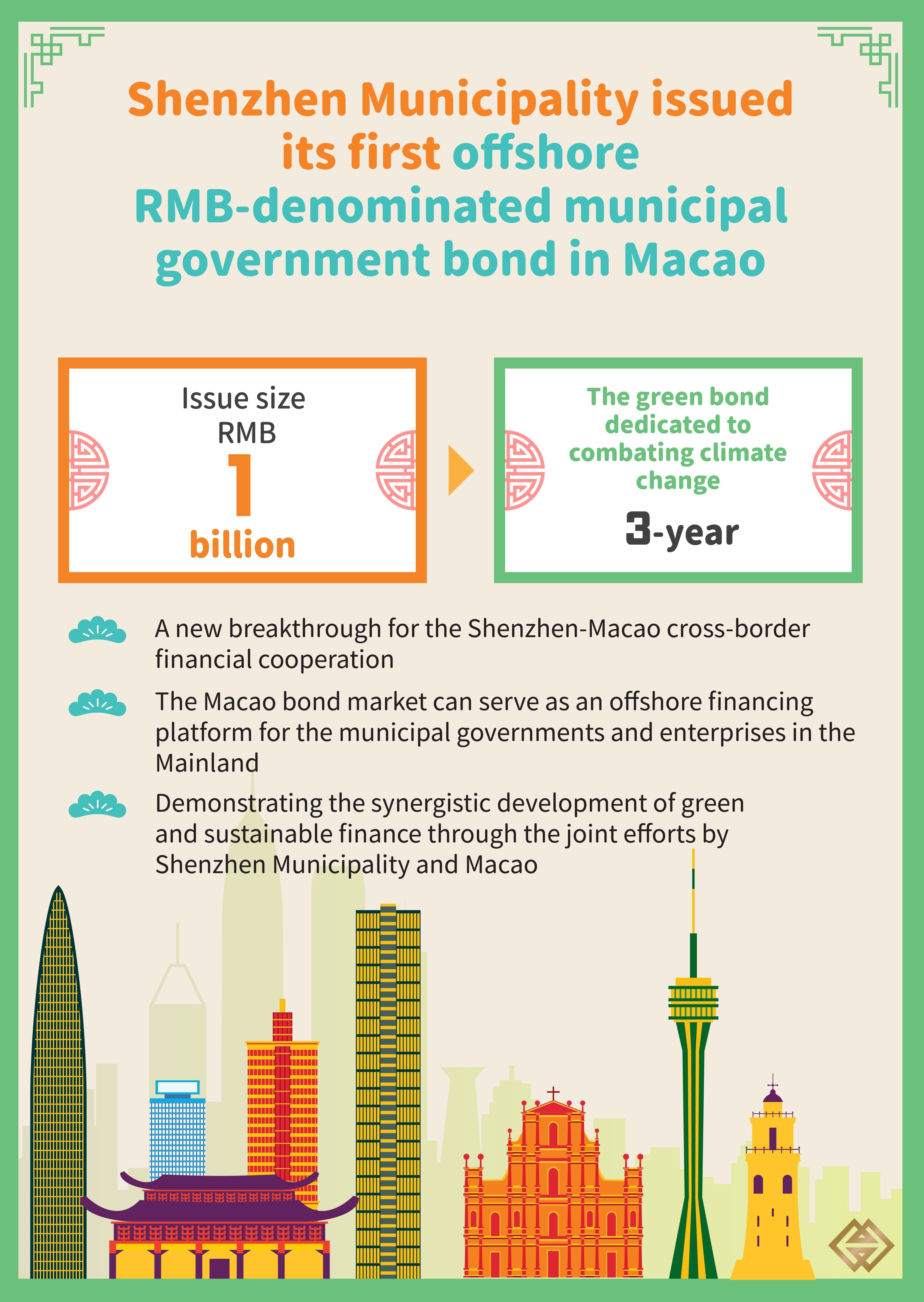 Against the backdrop of deepening financial cooperation in the Guangdong-Hong Kong-Macao Greater Bay Area, the first issuance of offshore RMB municipal government bond by the Shenzhen Municipality in Macao is a new breakthrough for the Shenzhen-Macao cross-border financial cooperation. It also marks another major milestone in the development of Macao’s bond market. Meanwhile,this issuance fully demonstrated that the Macao bond market can serve as an offshore financing platform for the municipal governments and enterprises in the Mainland, thereby facilitating the synergistic development of green and sustainable finance through the joint efforts by Shenzhen Municipality and Macao.