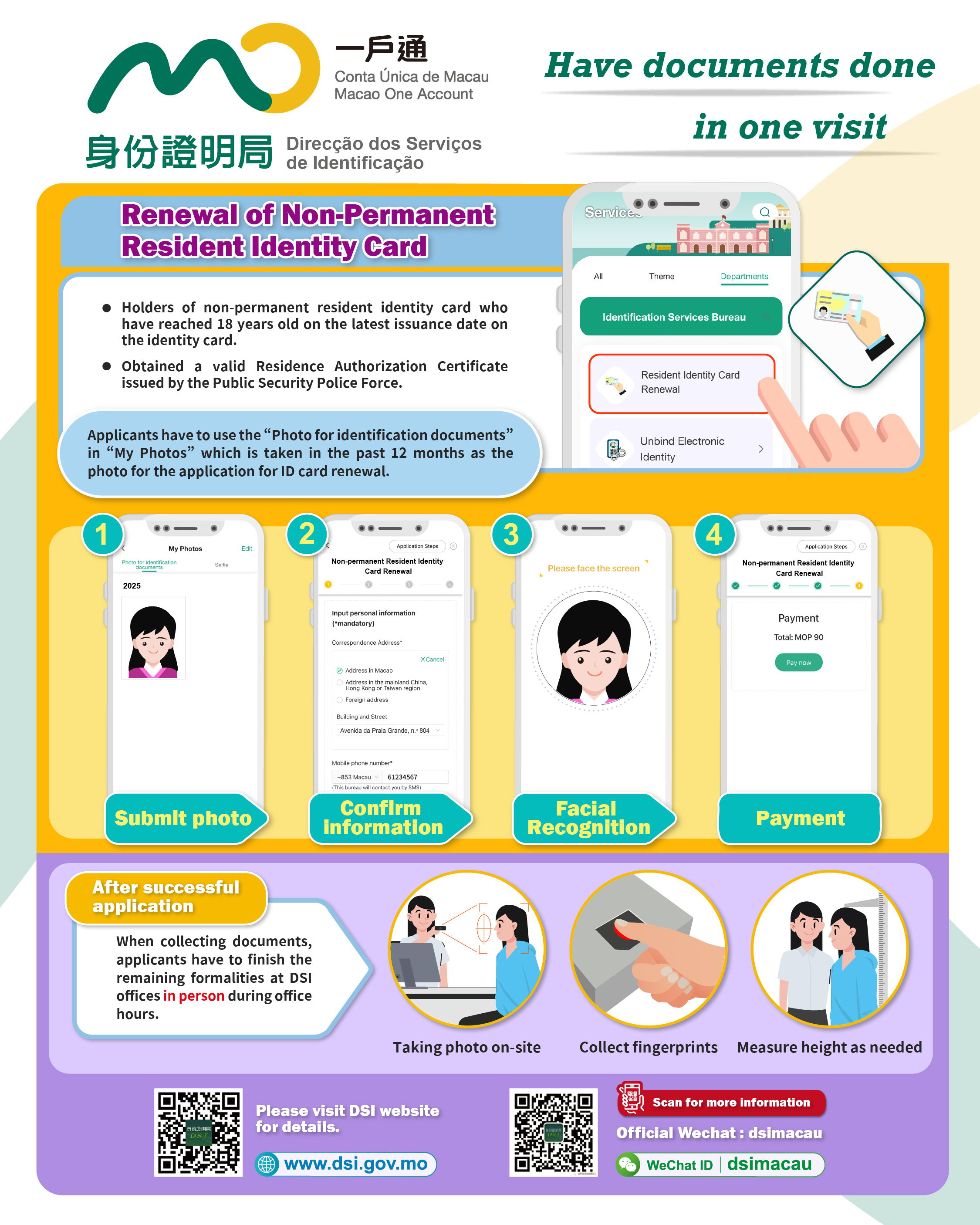 Macao residents aged 18 or above on the latest issuance date of the Macao SAR Non-permanent Resident Identity Card may use the “Resident Identity Card Renewal” service at Macao One Account within the validity period of the Residence Authorization Certificate collected via Macao One Account. When renewing their identity card, applicants should use the “Photo for identification documents” in “My photos” of Macao One Account as their identity card photo and operate according to the system instructions to complete the application procedure. The remaining formalities (including on-site photo taking, fingerprint impression taking, height measuring) can be completed when the applicants collect the identity card in person at the Identification Services Bureau during office hours.