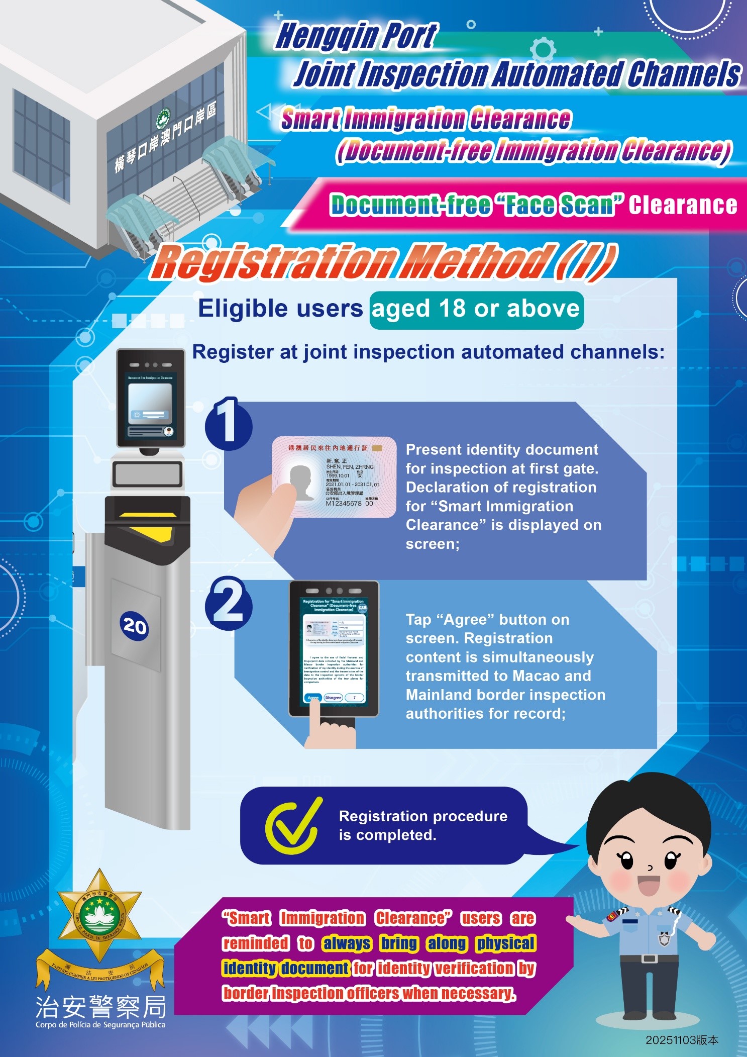 Registration is made when travelling from Macao to Hengqin or from Hengqin to Macao via the “joint inspection automated channels” of the Hengqin Port. Passengers present the identity document for inspection at the first gate and a declaration of the registration for “Smart Immigration Clearance” is displayed on the screen of the first gate. After the passengers read the declaration and tap the “Agree” button, the registration consent is transmitted to the Macao and Mainland border inspection authorities for record simultaneously. Then, the registration procedure is completed. Registered passengers can enjoy convenient immigration clearance by using “face scan” instead of “card scan” when they use the “joint inspection automated channels” of the Hengqin Port again.