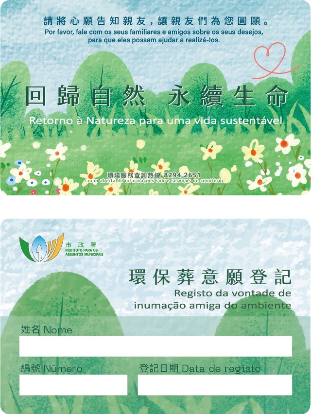 IAM encourages the public to plan in advance through “registration of intention of environmentally friendly burial” to explicitly express their preference. Should there be enquiries, the public can call 8294 2651 or visit the IAM website www.iam.gov.mo.