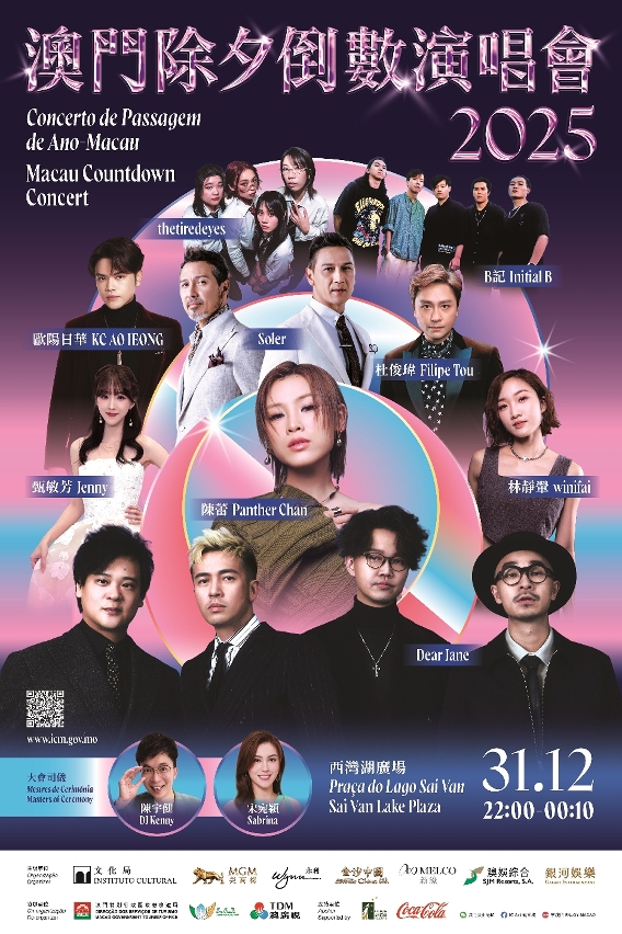 In order to celebrate the New Year with residents and tourists, the “2025 Macau Countdown Concert” and the “2025 Taipa Countdown Show” will be held on the evening of 31 December, at Sai Van Lake Plaza and Taipa Houses, respectively. Famous Hong Kong singer Panther Chan, music band Dear Jane, singer Karen Tong and various local singers and bands will present spectacular performances, creating a festive atmosphere. The “2025 Macau Countdown Concert” will not include fireworks display during the countdown events. The Cultural Affairs Bureau thanks for the public’s attention and understanding.