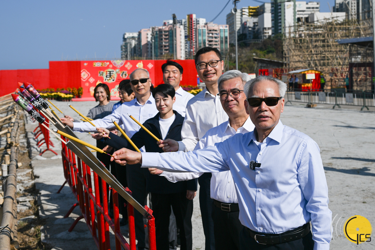 • Chefe do Executivo, Sam Hou Fai, e esposa, após visita à zona de queima de panchões na Taipa, tiram fotografias com o secretário para a Administração e Justiça, Wong Sio Chak, a chefe do Gabinete do Chefe do Executivo, Chan Kak, o presidente do Conselho de Administração do Instituto para os Assuntos Municipais, Chao Wai Ieng, e o presidente do Conselho Consultivo para os Assuntos Municipais, Hoi Lok Man, entre outras personalidades.