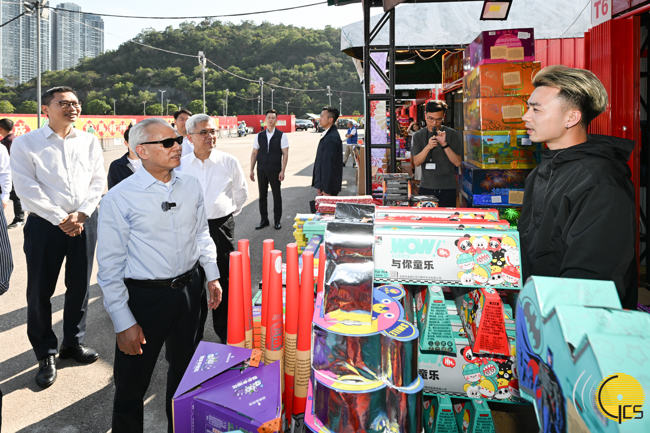 • Chefe do Executivo, Sam Hou Fai, durante a visita à zona de queima de panchões, na Taipa, conversa cordialmente com vendedores das bancas e deseja-lhes votos de prosperidade para os negócios.