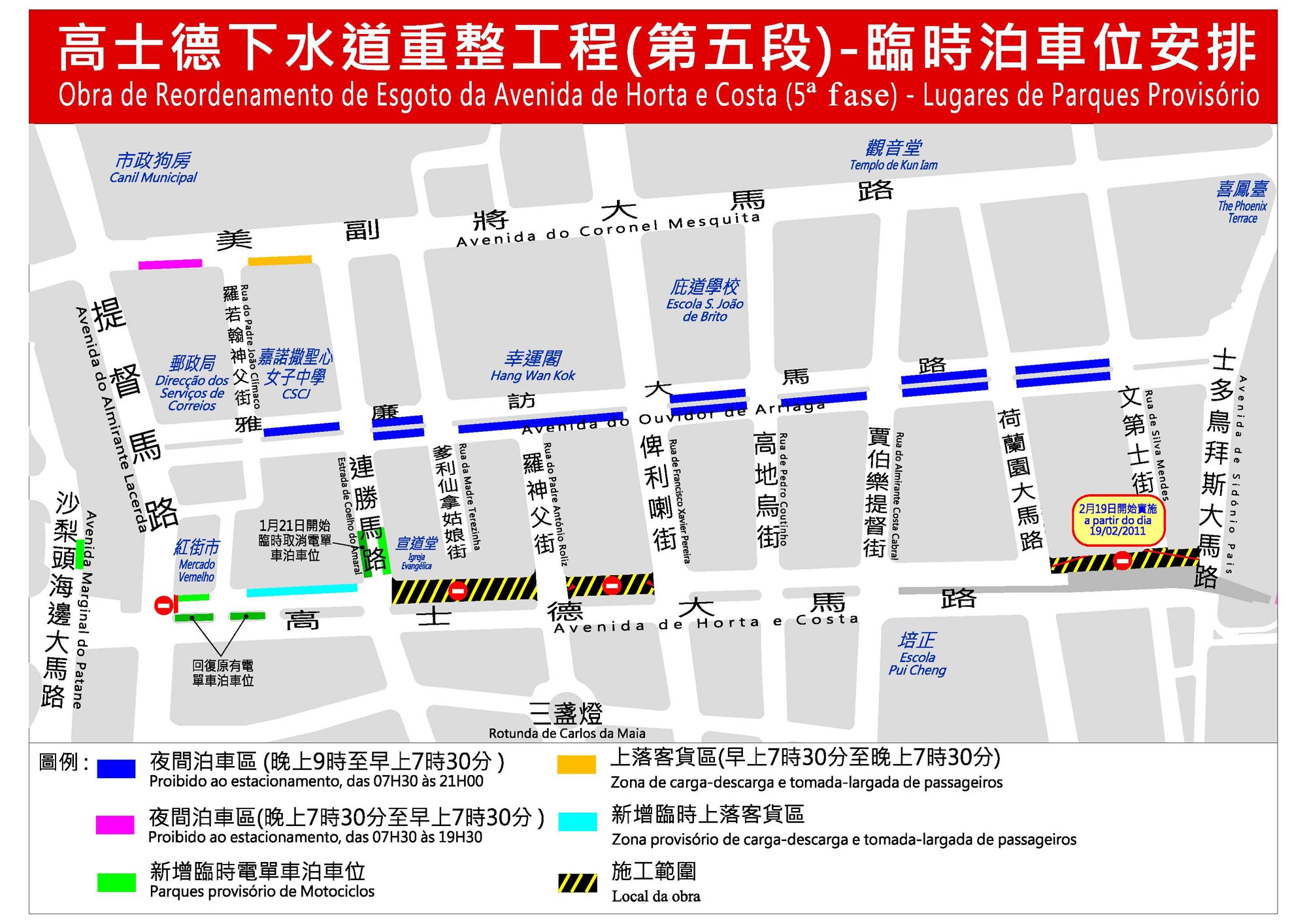 O Chefe da Divisão de Coordenação da DSAT, Mok Soi Tou, referiu que os trabalhos referentes ao 5.º troço da Avenida de Horta e Costa em direcção do Túnel da Guia, compreendido entre a Avenida do Conselheiro Ferreira de Almeida e a Avenida de Sidónio Pais, arrancarão oficialmente a partir das 10:00 horas do dia 19 do corrente mês, sendo o seu prazo de execução de aproximadamente 40 dias, em que se procurará a sua conclusão em princípios de Abril. Devido à interdição ao trânsito deste troço, durante a execução será proibido que veículos de comprimento superior a 7m da Avenida do Conselheiro Ferreira de Almeida virem à direita em direcção ao viaduto da Avenida de Horta e Costa, e o troço da Rua de Silva Mendes, compreendido entre a Avenida de Horta e Costa e a Avenida do Ouvidor Arriaga, passará a não ter saída. A par disso, a partir da meia-noite do dia 20 do corrente mês, a carreira nocturna N2 em direcção à Taipa depois de parar na paragem de autocarro localizada junto do Edifício Hang Wan Kok, não parará na paragem de autocarro localizada junto da Avenida de Horta e Costa/ Rua do Almirante Costa Cabral, passando assim em seguida a percorrer na Avenida do Ouvidor Arriaga e parar na paragem de autocarro localizada junto da Avenida do Ouvidor Arriaga/antiga Escola Pui Ieng, continuando depois a percorrer o mesmo itinerário anteriormente definido. Por outro lado, chamamos a atenção dos condutores que no intuito de se manter o trânsito entre a Avenida de Horta e Costa e a Avenida do Dr. Rodrigo Rodrigues, durante o período inicial da sua execução, manter-se-á o trânsito do viaduto da Avenida de Horta e Costa.