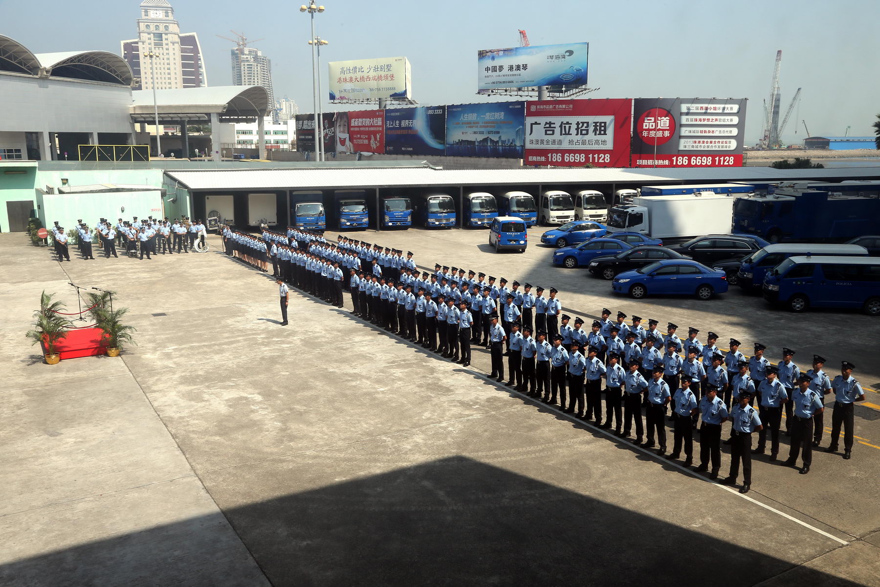 Uma cerimónia de tomada de posse de novos agentes. A cerimónia foi presidida pelo Exmo Sr. Comandante do CPSP, Superintendente Geral Lei Siu Peng, 2ºs Comandantes, Superintendente Lai Kam Kun e Superintendente Mui San Meng, e com a presença de chefias e responsáveis de vários Departamentos desta Corporação, onde foi efectuada a imposição das respectivas divisas aos novos agentes policiais, seguido de juramento como prontos para servir a RAEM.