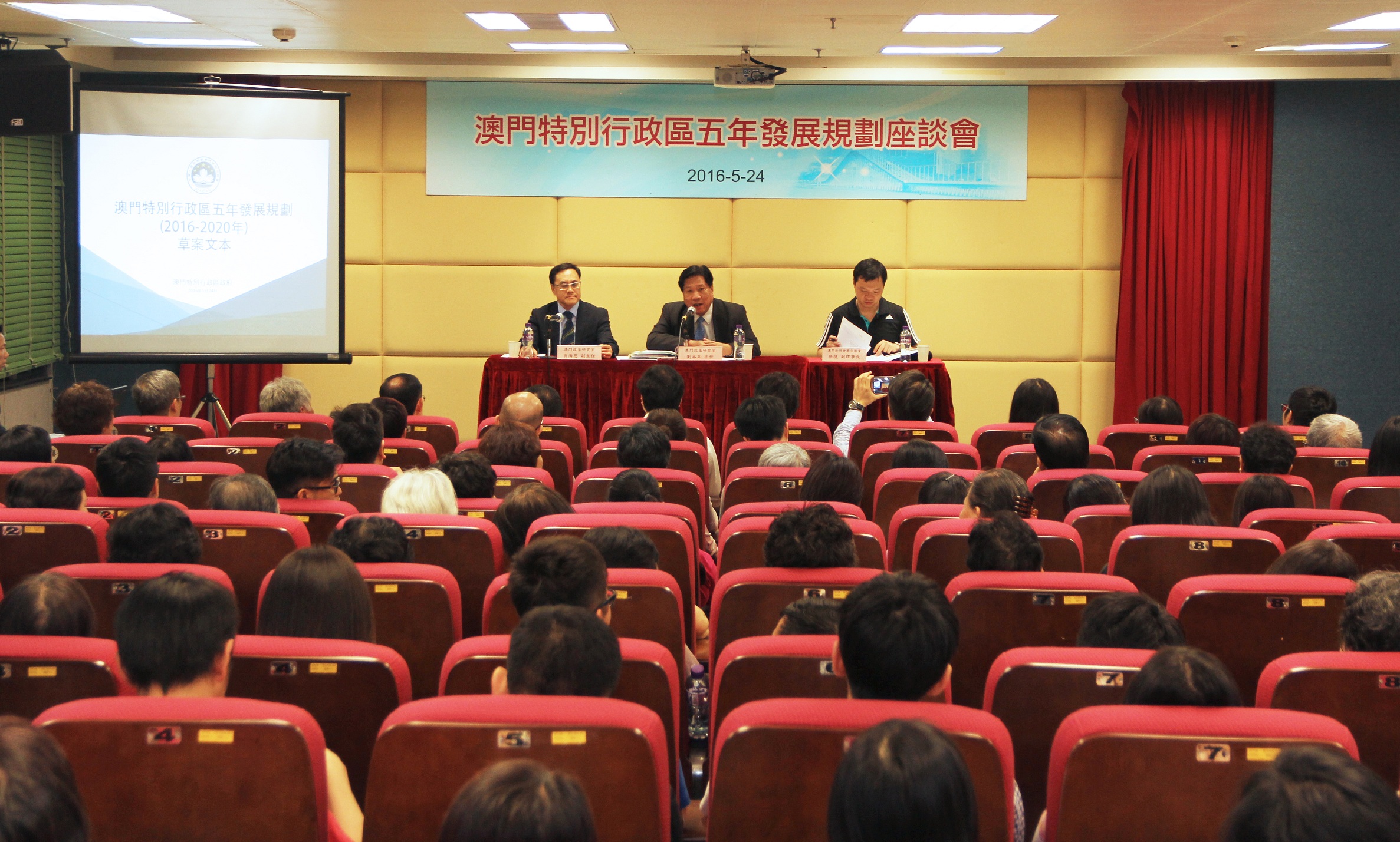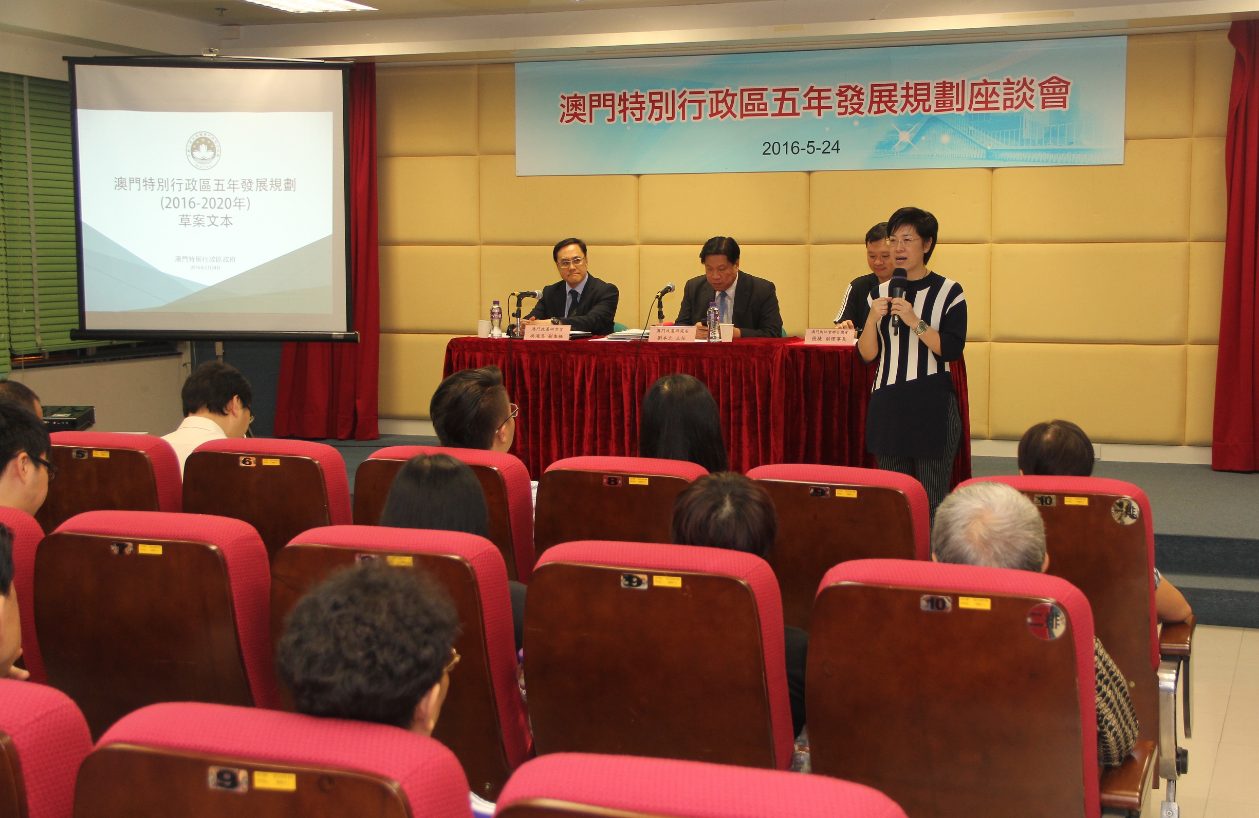 O Coordenador do Gabinete de Estudos das Políticas, Lao Pun Lap, e o Coordenador-Adjunto, Ng Hoi Ian, estiveram presentes no colóquio sobre o projecto do Plano Quinquenal de Desenvolvimento da RAEM (2016-2020), organizado pela União Geral das Associações dos Moradores de Macau (UGAMM), que teve lugar no dia 25 de Maio, ao fim do dia, no Edifício do Serviço Comunitário da UGAMM, durante a qual foi feita uma breve apresentação do conteúdo do projecto e um diálogo interactivo com os presentes.