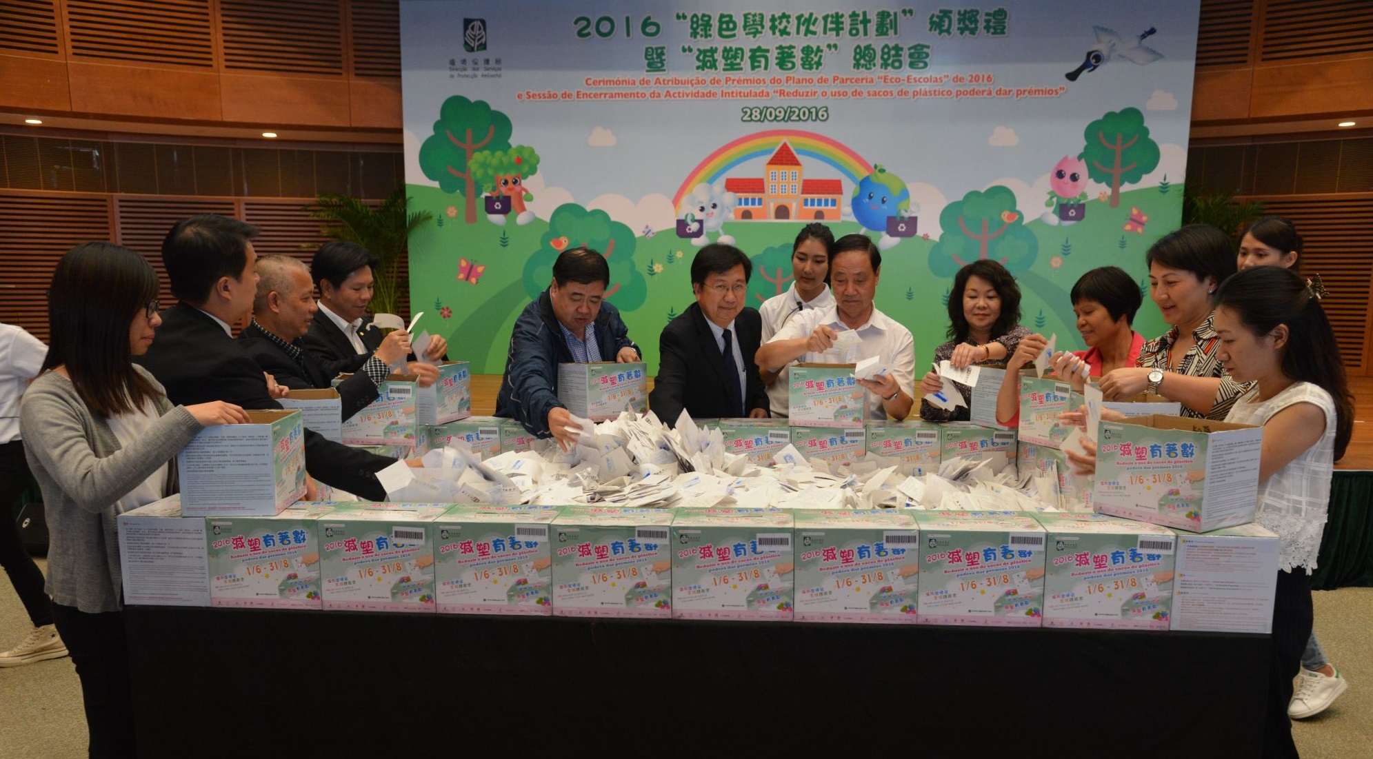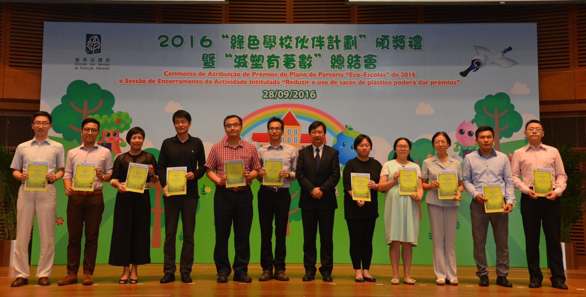 A Cerimónia de Atribuição de Prémios do Plano de Parceria “Eco-Escolas” de 2016 e a Sessão de Encerramento da Actividade Intitulada “Reduzir o uso de sacos de plástico pode dar prémios” foram realizadas, hoje (28 de Setembro), pela Direcção dos Serviços de Protecção Ambiental (DSPA). Este ano foram premiados cerca de 500 docentes e alunos provenientes das 34 escolas, 13 das quais louvadas com o Prémio de honra “Eco-Escolas” e 9 com o Prémio de Excelentes Desempenhos “Eco-Escolas”. Foi ainda realizado o sorteio de prémios da actividade “Reduzir o uso de sacos de plástico pode dar prémios 2016”. A DSPA espera que, mediante as actividades destinadas ao sector escolar e ao público, sejam promovidas as acções a nível de educação ambiental por meios diferentes e incentivada a prática contínua de actos amigos do ambiente pelos cidadãos na vida quotidiana.