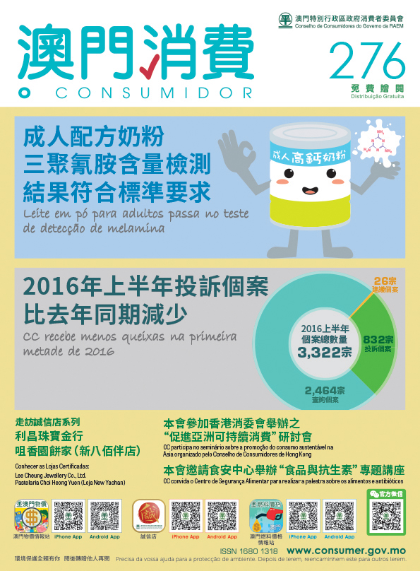 Os cidadãos interessados agora podem obter a revista “O Consumidor” n.º 276 nos Postos de Atendimento ao Público do CC sitos respectivamente na Av. Horta e Costa, n.º 24, Edf. Cheung Heng, R/C e na Rua Nova da Areia Preta, Centro de Serviços da RAEM, 1.º andar, Zona M, bem como no Centro de Informações ao Público situado na Rua do Campo, Vicky Plaza, nas bibliotecas que funcionam sob a tutela do Instituto Cultural, na Sala de leitura da Associação Comercial de Macau ("Biblioteca Octogonal") e na Plaza Cultural Macau, ou, podem visualizar os referidos conteúdos na página electrónica do CC (www.consumer.gov.mo) e na sua conta de Wechat.