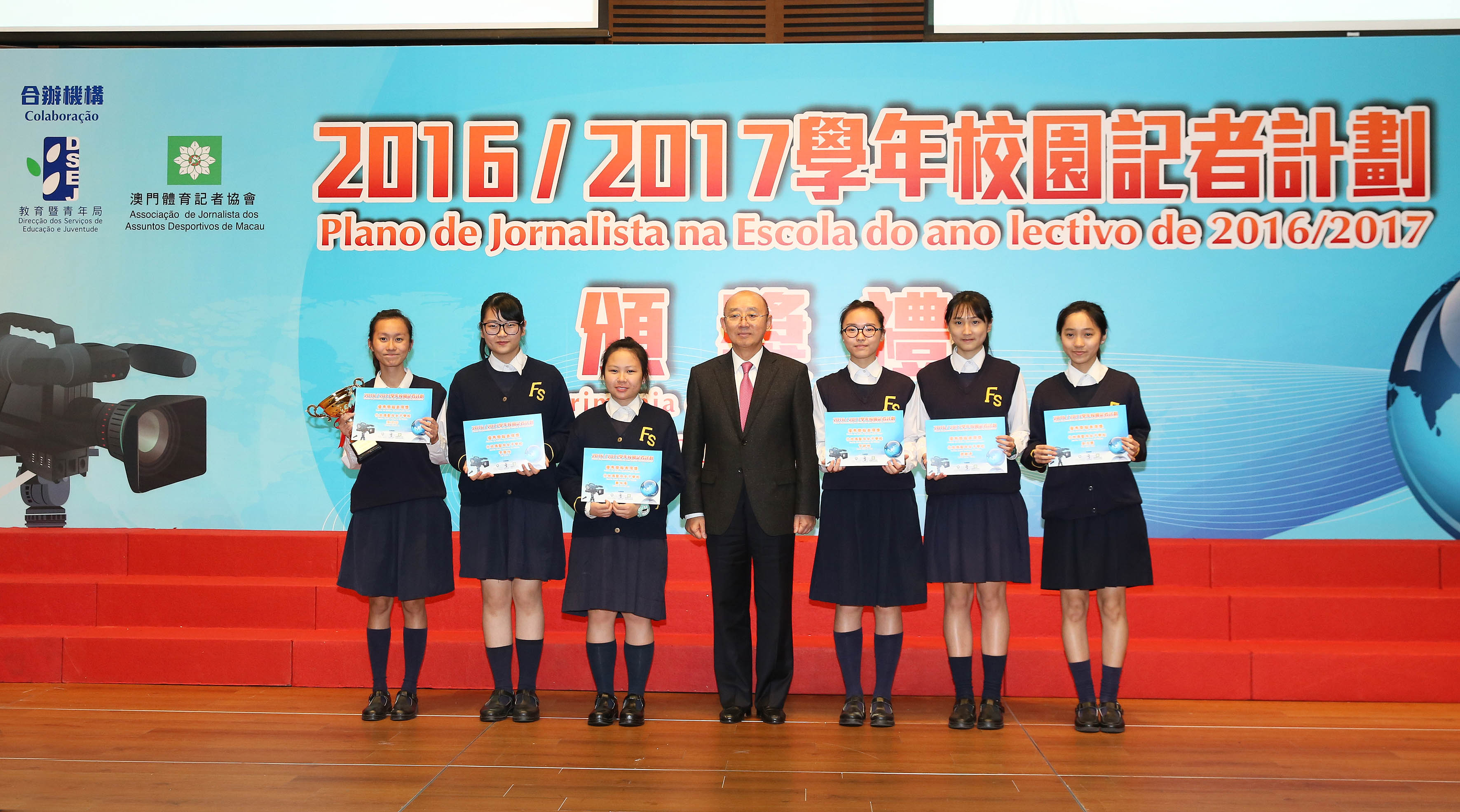 O “Plano de Jornalista de Escola” do ano lectivo de 2016/2017, organizado pela Direcção dos Serviços de Educação e Juventude (DSEJ), em conjunto com a Associação dos Trabalhadores da Comunicação Social de Macau e a Associação de Jornalistas dos Assuntos Desportivos de Macau, teve início em Novembro de 2016. Esta edição, sob o tema a “promoção do crescimento mental e físico, formação de boa capacidade de adaptação à comunidade”, abrangeu as áreas de jornais e revistas e de média electrónicos, e contou com a participação de 108 alunos oriundos de 20 escolas de Macau. Através da aprendizagem, formação, visitas e actividades práticas, foram seleccionadas pelo júri sete obras excelentes, cuja cerimónia de entrega de prémios realizou-se na tarde do dia 17 de Março de 2017, no Centro de Ciência de Macau, para celebrar os brilhantes resultados alcançados.