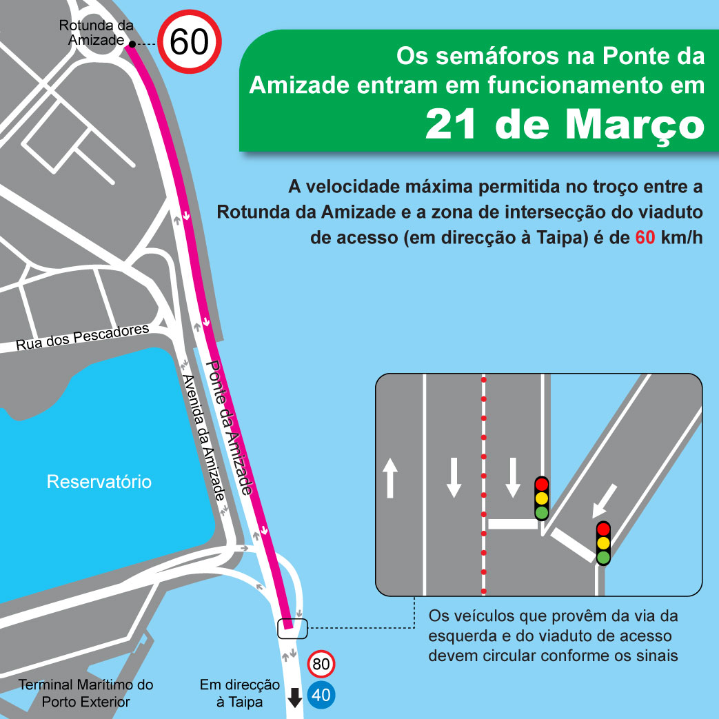 Os semáforos instalados na zona de intersecção do viaduto de acesso à Ponte da Amizade junto do Terminal Marítimo do Porto Exterior entram em funcionamento no dia 21 de Março (terça-feira), pelas 11h00, simultaneamente, será ajustado o limite de velocidade no troço entre a Rotunda da Amizade e a zona de intersecção do viaduto de acesso (em direcção à Taipa) para 60 km/h. A Direcção dos Serviços para os Assuntos de Tráfego (DSAT) espera que a circulação dos veículos consiga ser controlada de uma forma ordenada mediante a entrada em funcionamento desses semáforos, a fim de canalizar a circulação que provêm do viaduto de acesso e do tabuleiro principal, reduzindo o congestionamento de trânsito.