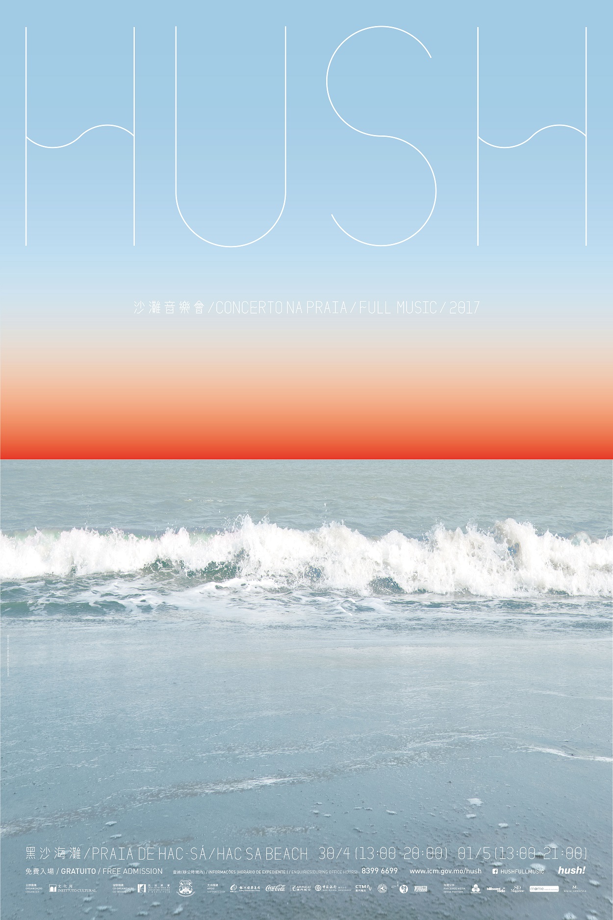 Para mais informações, é favor visitar a página electrónica de “HUSH!! Concerto na Praia” em www.icm.gov.mo/hush e seguir a página do “HUSH!! Concerto na Praia” no Facebook e a conta oficial do IC “ICmacao” no WeChat.