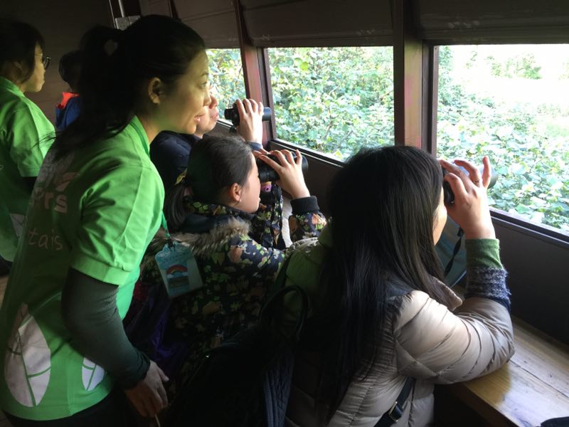• Os membros da equipa – Fãs Ambientais que prestam auxílio no serviço de visitas guiadas às Zonas Ecológicas do Cotai, estão a explicar aos visitantes que estão a contemplar as aves.