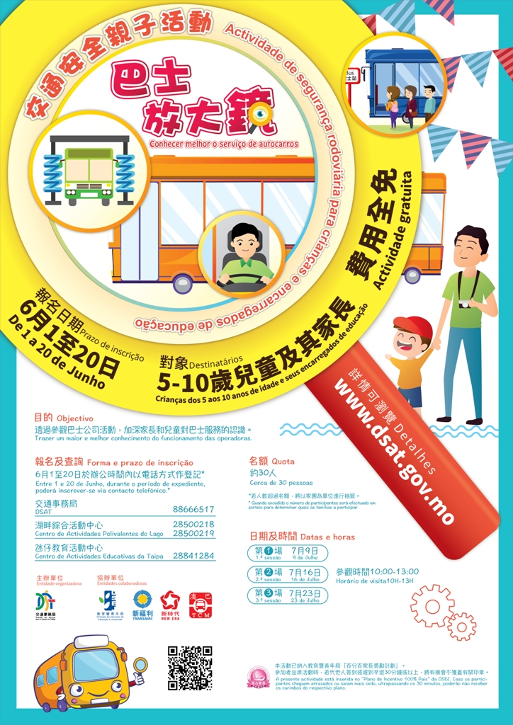 A partir de 9 de Julho (domigo), a Direcção dos Serviços para os Assuntos de Tráfego (DSAT) vai realizar, durante três domingos consecutivos, a actividade de segurança rodoviária “Conhecer melhor o serviço de autocarros”. Serão organizadas, para crianças e seus encarregados de educação, visitas às instalações das operadoras de autocarros, com intuito de as fazer conhecer melhor o funcionamento deste serviço. Os interessados podem fazer a inscrição via contacto telefónico na DSAT (8866 6517), noCentro de Actividades Polivalentes do Lago (2850 0218/2850 0219), ou no Centro de Actividades Educativas da Taipa (2884 1284), entre 1 a 20 de Junho.
