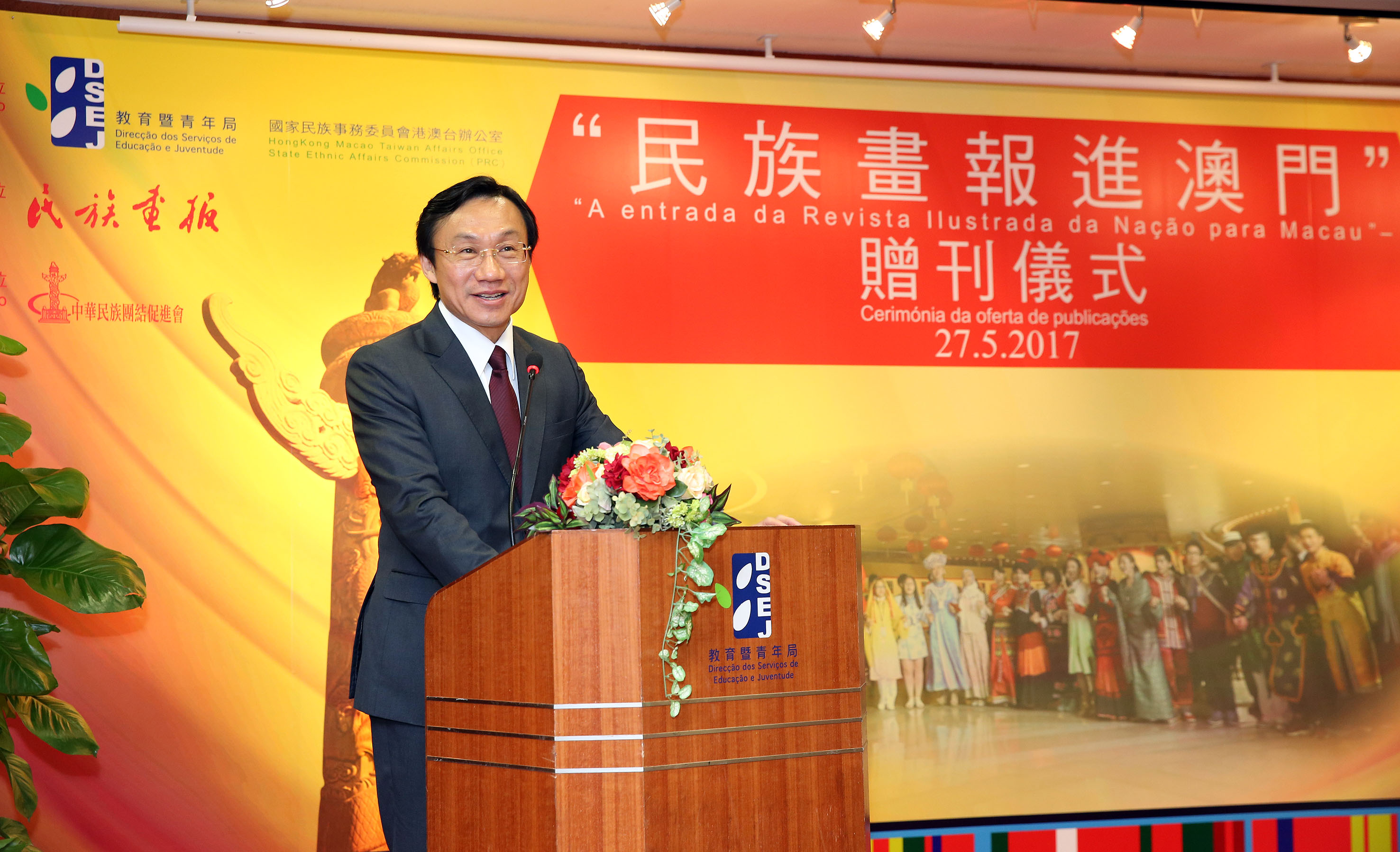 Organizada em conjunto pela Direcção dos Serviços de Educação e Juventude (DSEJ) e pelo Gabinete para os Assuntos de Hong Kong, Macau e Taiwan da Comissão para os Assuntos das Nacionalidades do Estado, realizada pela Associação Promotora de União da Nação da China e apoiada pela Editora da Revista Ilustrada da Nação, a Cerimónia de Oferta de Publicações “A entrada da Revista Ilustrada da Nação para Macau” decorreu no dia 27 de Maio, na parte da manhã, no Salão de Conferências Confúcio, no 1.o andar do edifício-sede da DSEJ. O Secretário para os Assuntos Sociais e Cultura, Alexis Tam, a Directora dos Serviços de Cultura e Propaganda da Comissão para os Assuntos das Nacionalidades do Estado, Wu Cuiying, o subchefe do Departamento de Coordenação do Gabinete de Ligação do Governo Central na RAEM, Sheng Gang, o subdirector da DSEJ, Lou Pak Sang, a vice-redactora-chefe da Editora da Revista Ilustrada da Nação, Yu Hui e o presidente da Associação Promotora de União da Nação da China, Vong Veng Hin presidiram à cerimónia de oferta da “Revista Ilustrada da Nação” aos representantes das escolas de Macau.