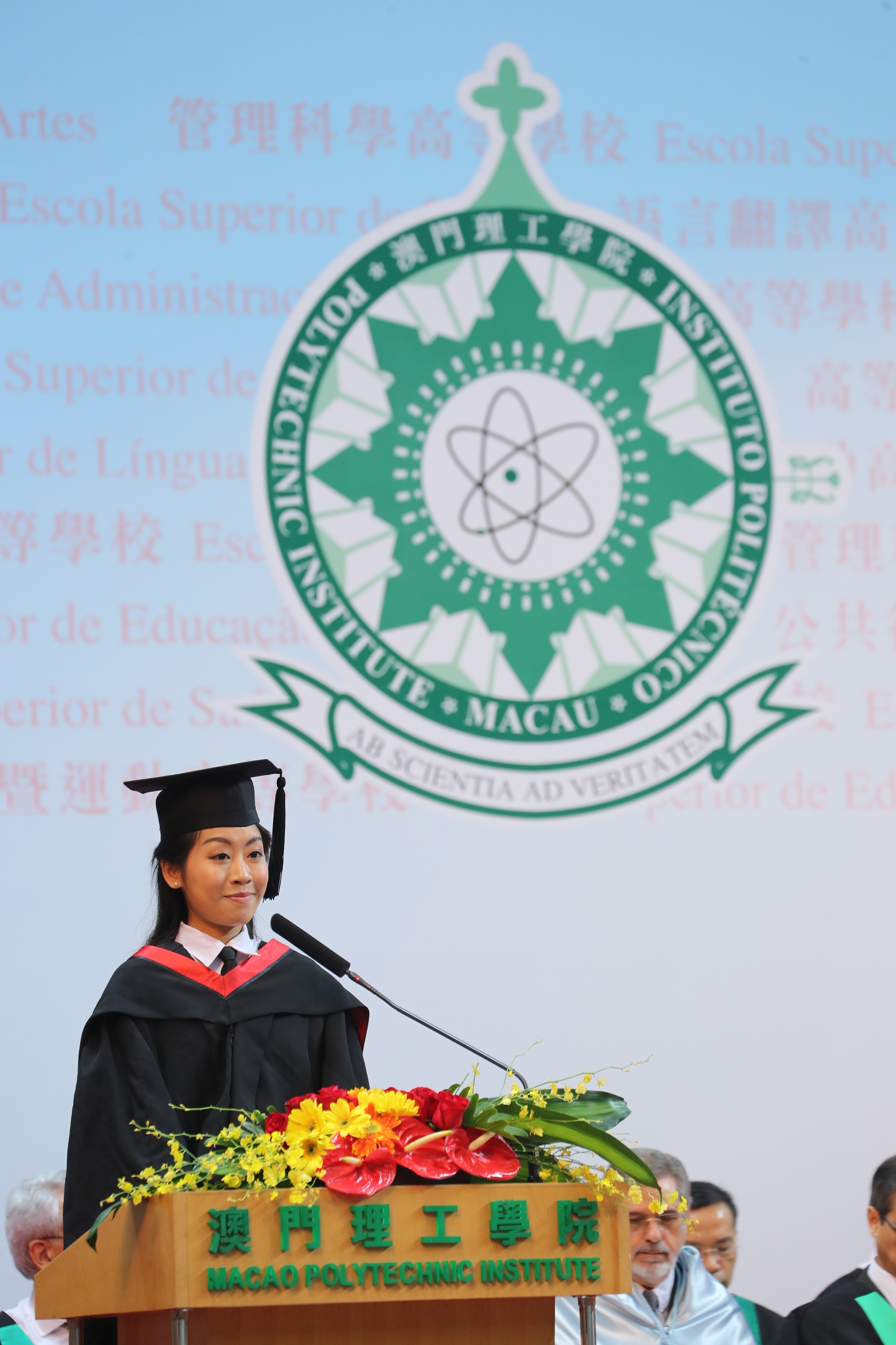A representante dos graduados, Cheung Pui Weng, fez discurso manifestando agradecimento aos professores por terem transmitido todos os conhecimentos aos seus alunos com sinceridade e atenção às diferenças entre cada aluno, e nunca abandonarem nenhum aluno. “Ter por base os alunos”, esta forma e atitude pedagógicas adoptadas pelos professores são exactamente o ponto-chave da formação de alunos qualificados, sendo também um motivo de os graduados terem orgulho no IPM. Além disso, estimulou os alunos graduados para se aperfeiçoarem, contribuindo para a sociedade e valorizando a reputação do IPM.