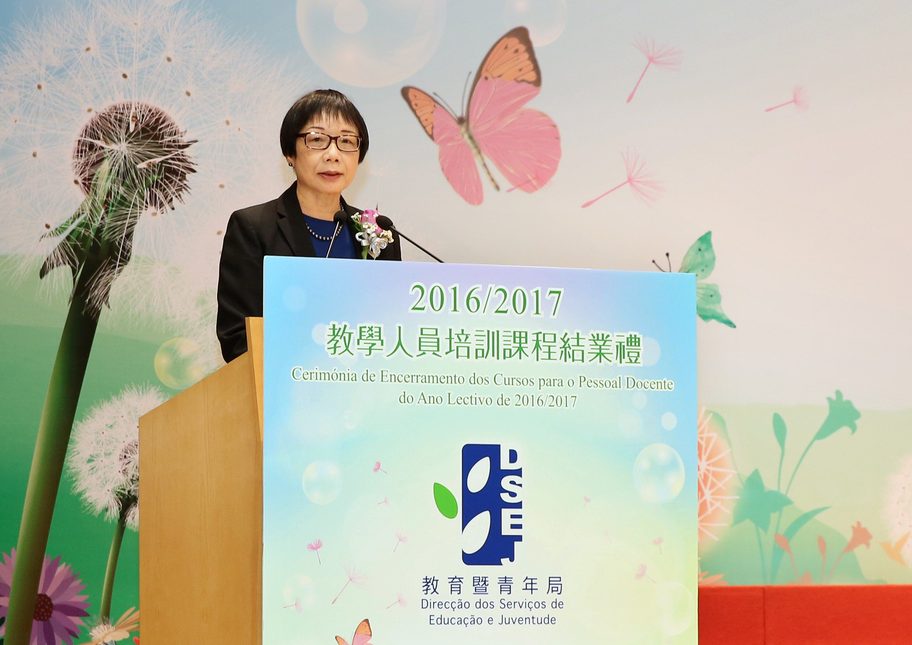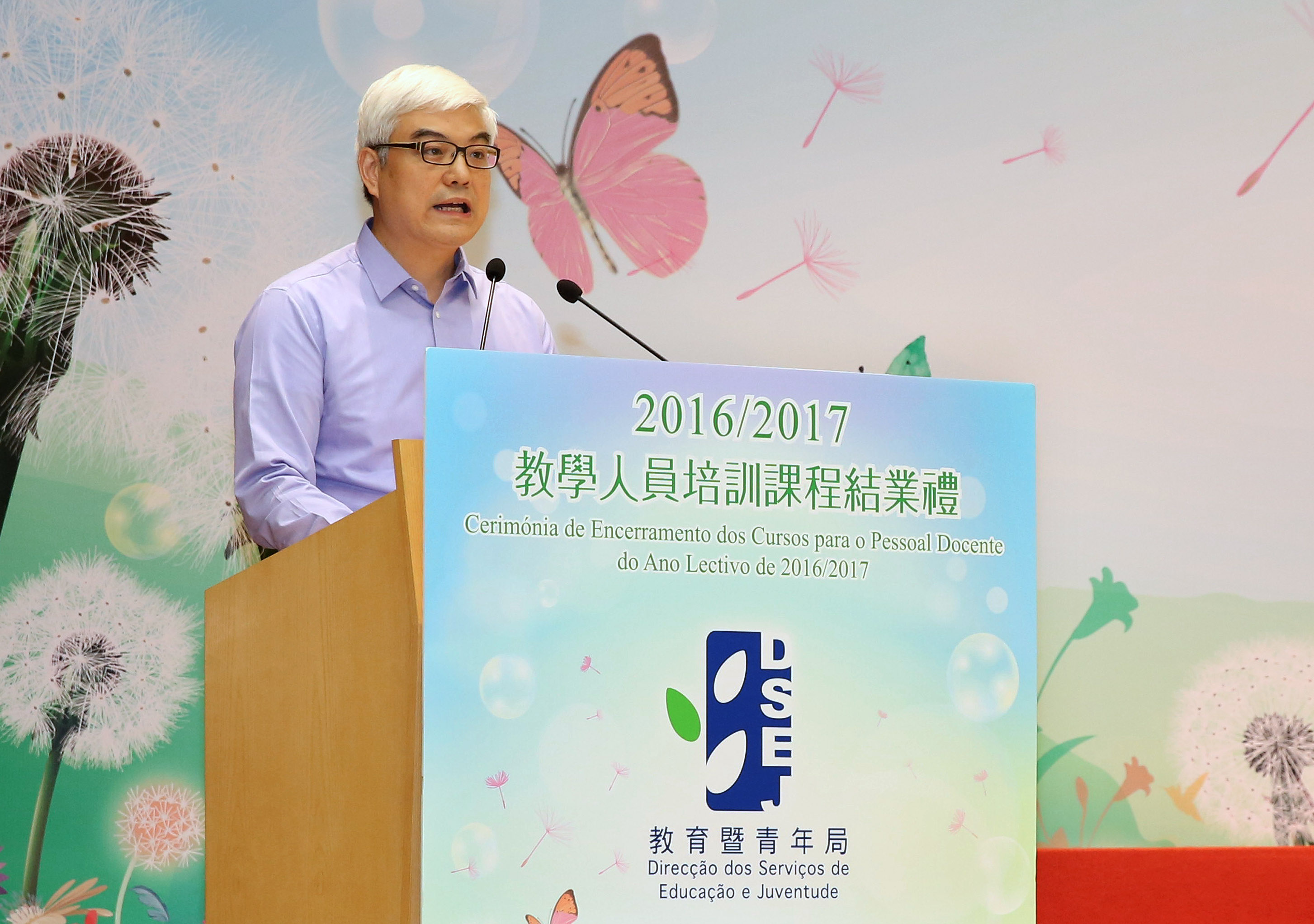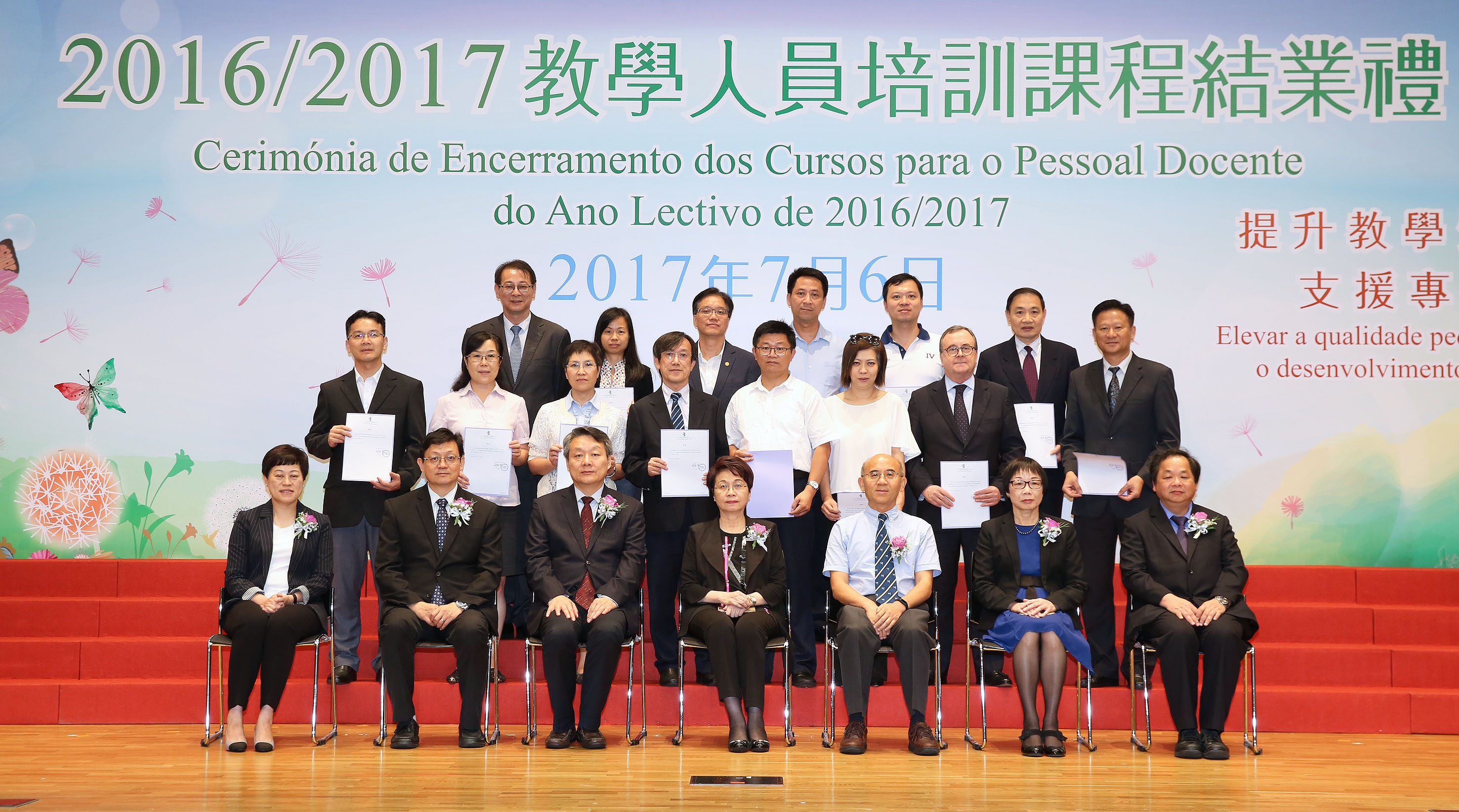 Para partilhar com o pessoal docente os bons resultados e a satisfação alcançada após a conclusão destes cursos e, ao mesmo tempo, incentivar estes profissionais a continuarem os estudos para assim contribuírem para o melhoramento constante da qualidade da educação, a DSEJ realizou a “Cerimónia de encerramento dos cursos de formação para o pessoal docente do ano lectivo de 2016/2017” na tarde do dia 6 de Julho, no Auditório da Escola Keang Peng (Secção Primária). A referida cerimónia contou com a presença dos seguintes convidados: a directora da DSEJ, Leong Lai, o subdirector adjunto do Departamento de Cultura e Educação do Gabinete de Ligação do Governo Popular Central na RAEM, Shao Bin, os subdirectores da DSEJ, Lou Pak Sang e Kuok Sio Lai, o director da Faculdade de Educação da Universidade de Macau, Fan Xitao, a presidente da Direcção da Associação de Educação de Macau, Chan Hong, o presidente da Direcção da Associação das Escolas Católicas de Macau, Vong Pio, bem como os representantes e formadores das instituições de formação, os directores escolares e mais de 300 docentes que participaram nos cursos.