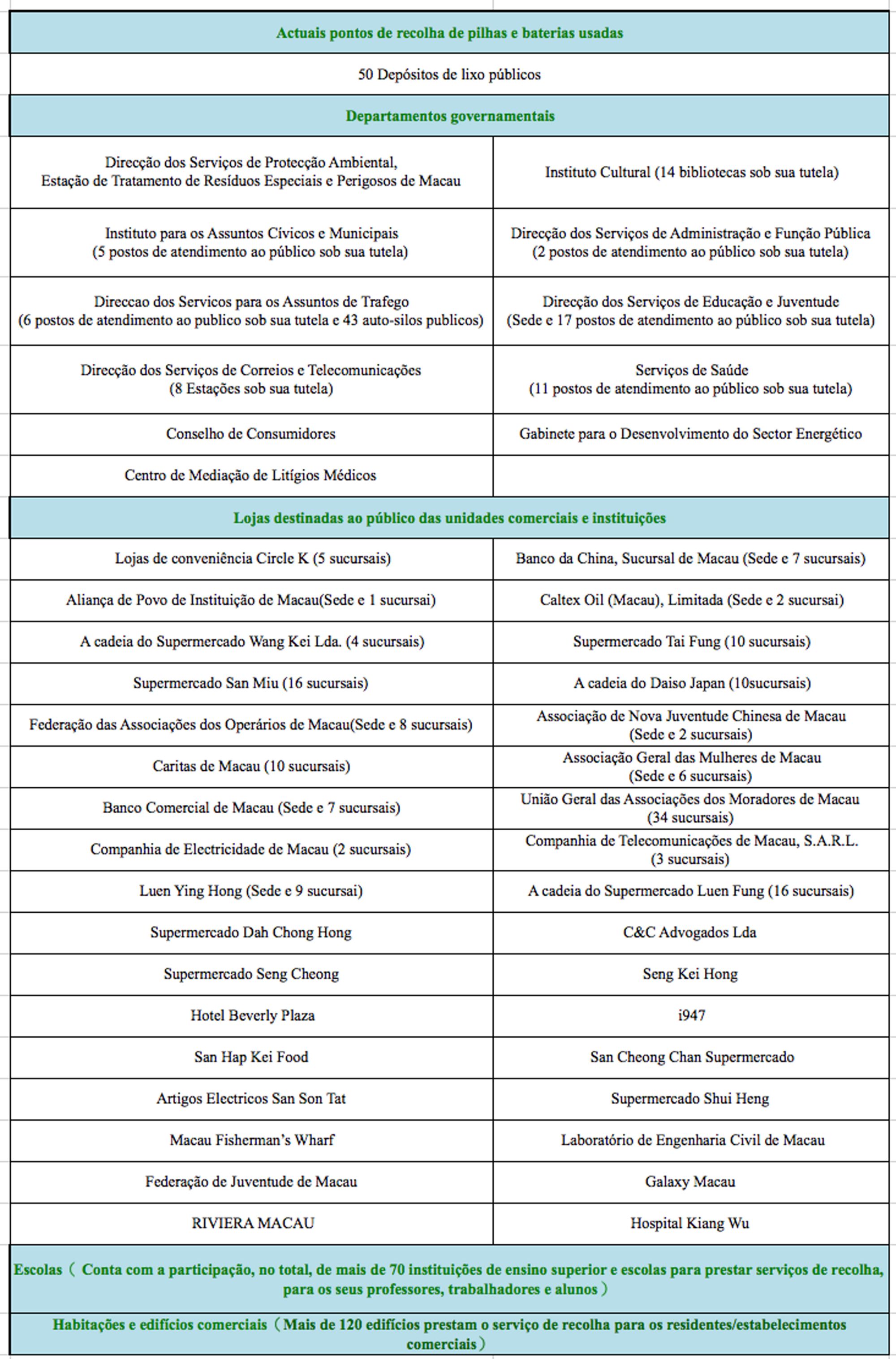 Desde o lançamento do Plano da Recolha de Pilhas e Baterias Usadas de Macau pela DSPA no final de 2016, graças ao apoio e colaboração activos dos diversos sectores, encontram-se disponíveis mais de 500 postos de recolha nas diversas zonas de Macau, nomeadamente nas escolas, nas associações, nos edifícios habitacionais e comerciais, nos supermercados e nas lojas de conveniência, nos serviços públicos, etc. (Consulte a página electrónica da DSPA: http://www.dspa.gov.mo/richtext.aspx?a_id=101414). Desde o início do plano, e até ao presente momento, foram recolhidos mais de 3.500 quilos de pilhas e baterias usadas, o que reflecte que muitos cidadãos e instituições têm vindo a praticar os comportamentos ambientais. No que diz respeito às referidas pilhas e baterias recolhidas no âmbito do plano, a DSPA empenhará esforços para proceder, no 4.º trimestre do corrente ano, à sua transformação em recursos através da cooperação com outras regiões. A DSPA salienta, também, que tem de cumprir, rigorosamente, os requisitos sobre o controlo dos movimentos transfronteiriços de resíduos perigosos previstos na Convenção de Basileia.
