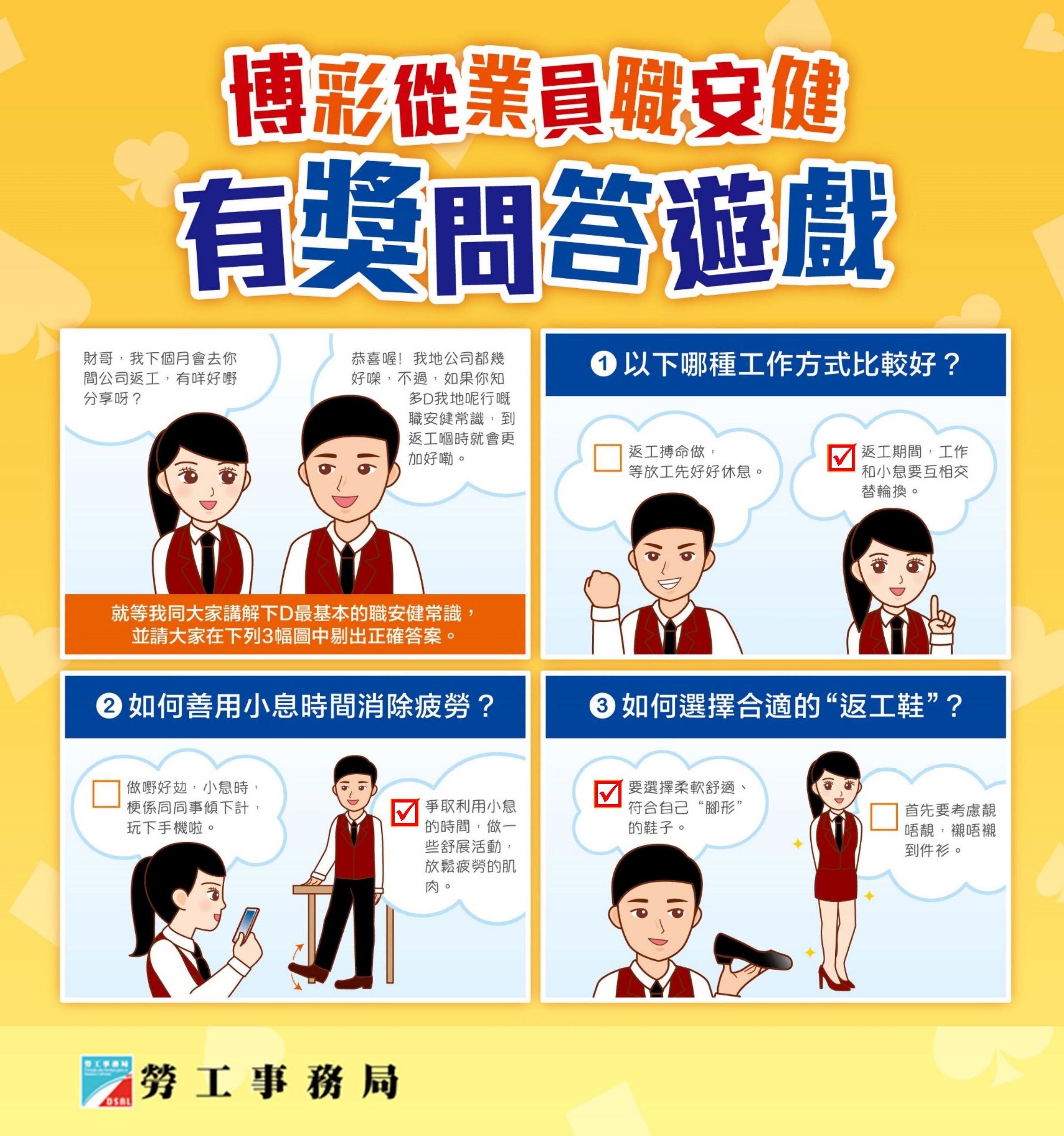 A fim de aumentar os conhecimentos dos cidadãos sobre segurança e saúde ocupacional, e ao mesmo tempo reforçar a sua sensibilização para esta área e promover o desenvolvimento da cultura da segurança e saúde ocupacional em Macau, a Direcção dos Serviços para os Assuntos Laborais (DSAL) realizou o “jogo de perguntas e respostas com prémios sobre a segurança e saúde ocupacional dos trabalhadores da indústria do jogo” que terminou no mês passado. Esta actividade foi muito bem acolhida pela população, tendo sido recebidos 2 636 formulários de participação, dos quais 2 606 tinham as respostas todas correctas, qualificando-se para o sorteio. A DSAL realizou recentemente a cerimónia de sorteio dos premiados. Os vencedores irão receber um cupão de supermercado no valor de 100 patacas, sendo os mesmos avisados por telefone ou por mensagem de telemóvel.