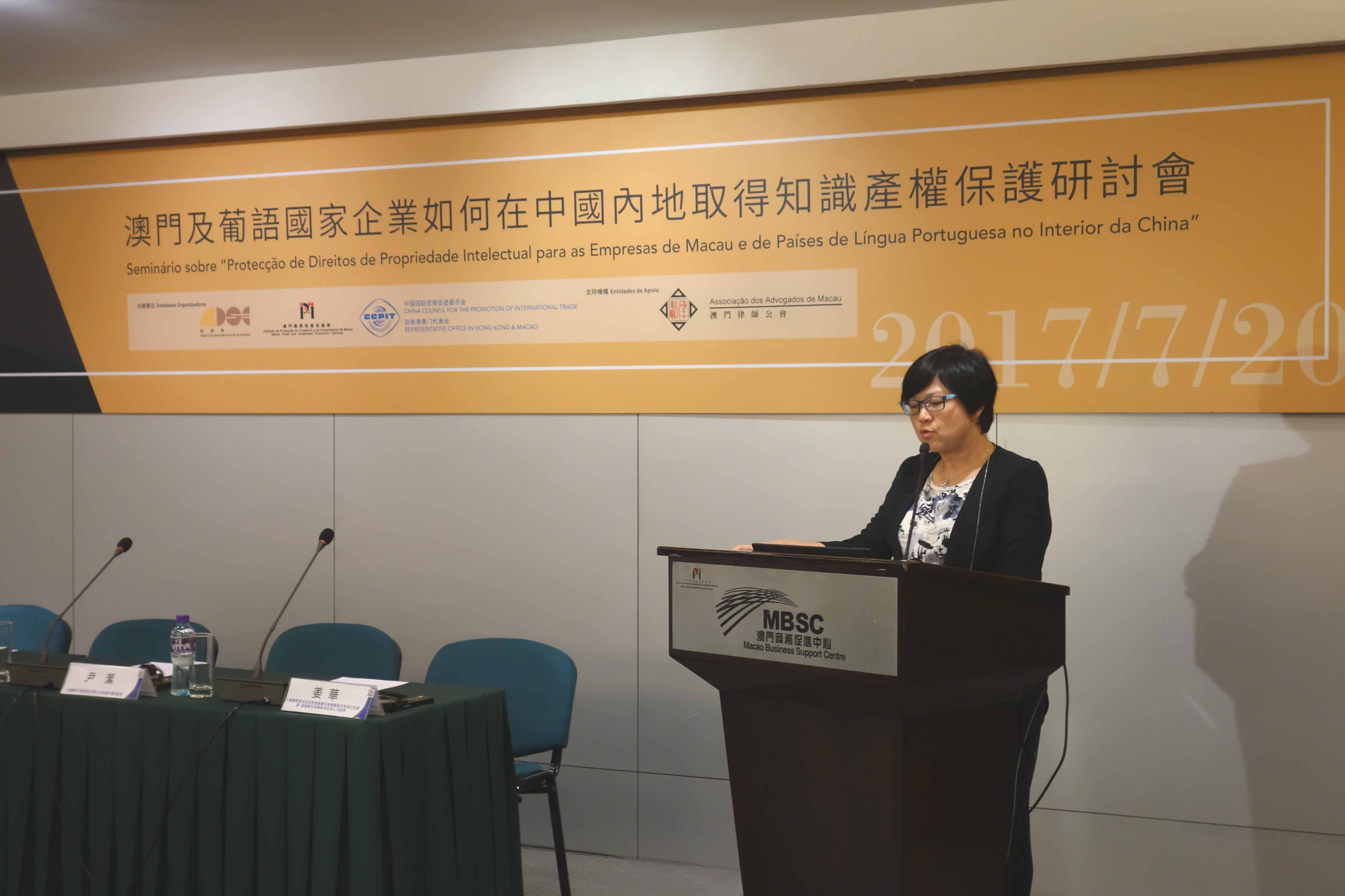 O seminário foi moderado pela Chefe do Departamento de Propriedade Intelectual da Direcção dos Serviços de Economia, Dra. Cheang Hio Man, e teve como oradores, o Dr. Ma Yongli, advogado, na área de patentes, da “China Patent Agent (Hong Kong) Ltd., aDra. Wan Kit, advogada, na área de marcas comerciais, da “China Patent Agent (Hong Kong) Ltd. e a Dra. JiangHua, advogada, na área de patentes do CCPIT Patent&Trademark (H.K) Law Office, e gerente da CLT Patent™ Mark (Hong Kong) Limited. Através da análise de diferentes casos, os oradores exploraram conjuntamente com os participantes sobre a forma de proteger as patentes e marcas registadas no Interior da China, a situação de pedido de patentes e o recente desenvolvimento da protecção de patentes, tudo isto, no intuito de ajudar às empresas, através de diversas formas “expandir-se para o exterior”.