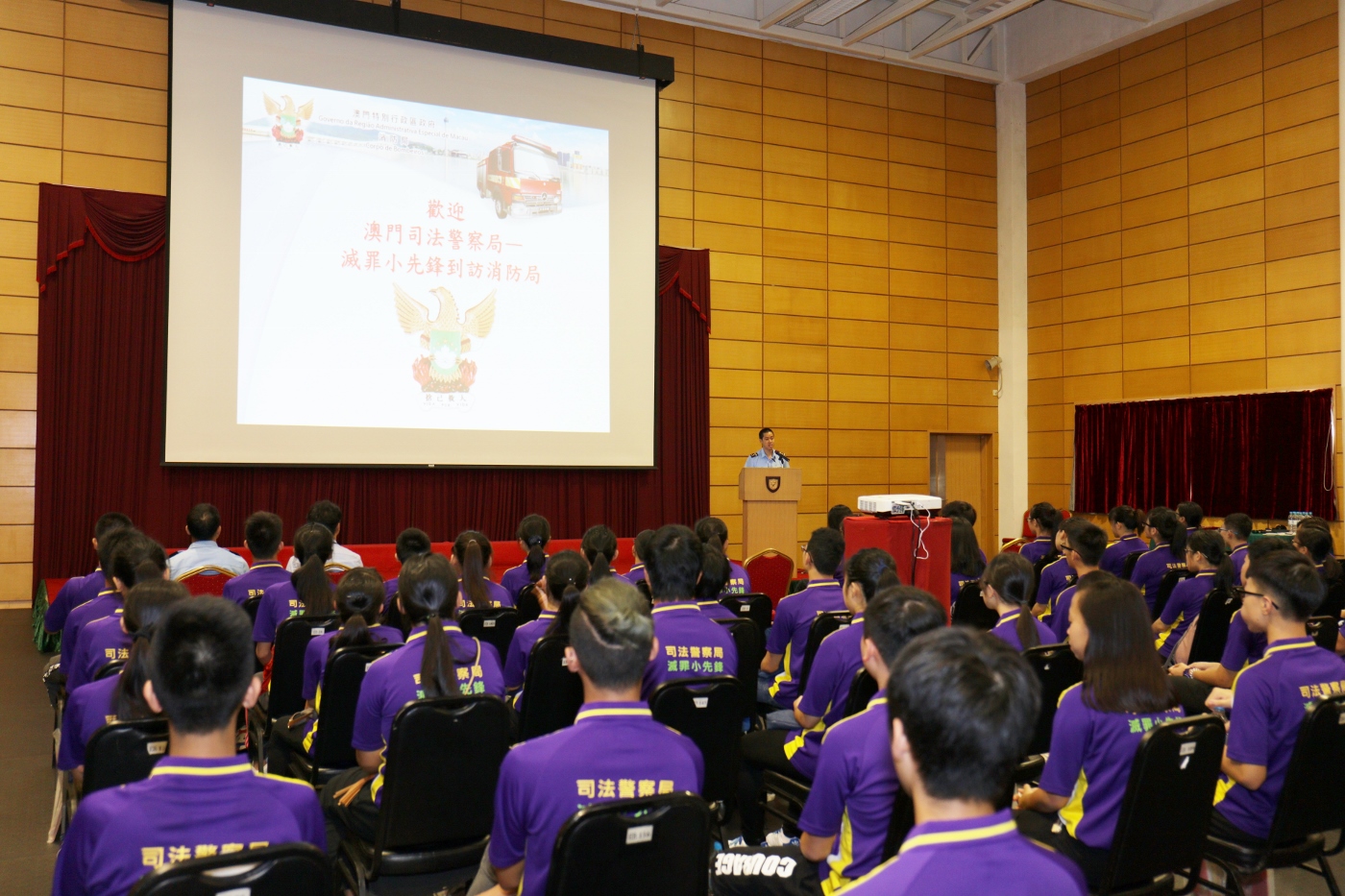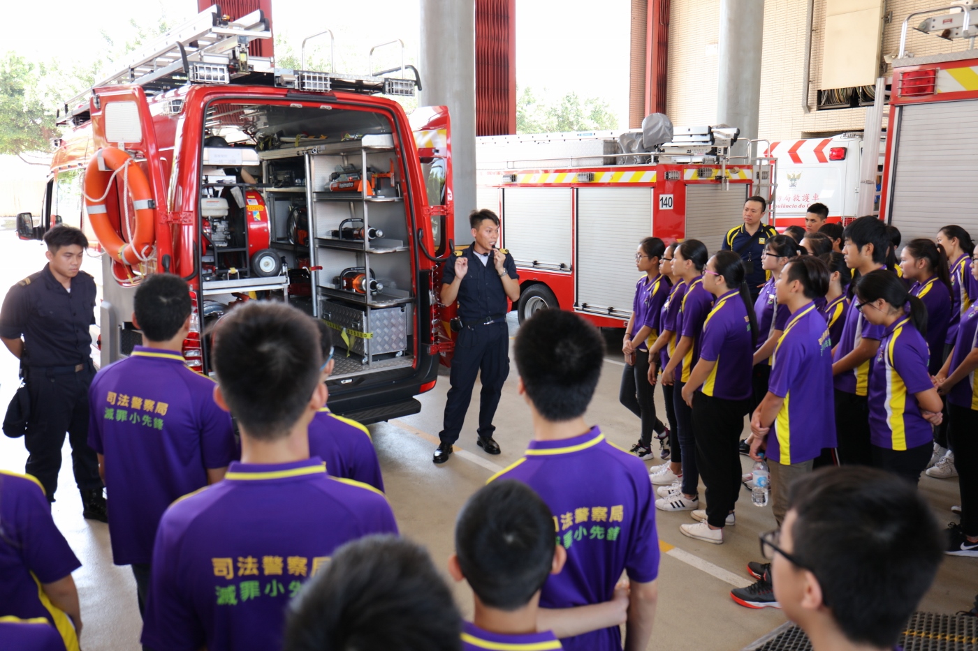 Com o objectivo de executar os três princípios do policiamento da área de segurança, designadamente : policiamento activo, policiamento comunitário e policiamento de proximidade, o Corpo de Bombeiros (CB) organizou hoje (dia 26 de Julho de 2017), actividade de experiência dedicada aos formandos do “Guia juvenil para combater o crime” da Polícia Judiciária, que teve lugar no Comando e Posto Operacional do Lago Sai Van do CB, para que os mesmos conseguissem inteirar-se mais dos nossos trabalhos através da visita e experimentação de tarefas dos bombeiros, a fim de fortalecer as suas consciências de segurança contra incêndios e os seus espíritos de serviço comunitário.