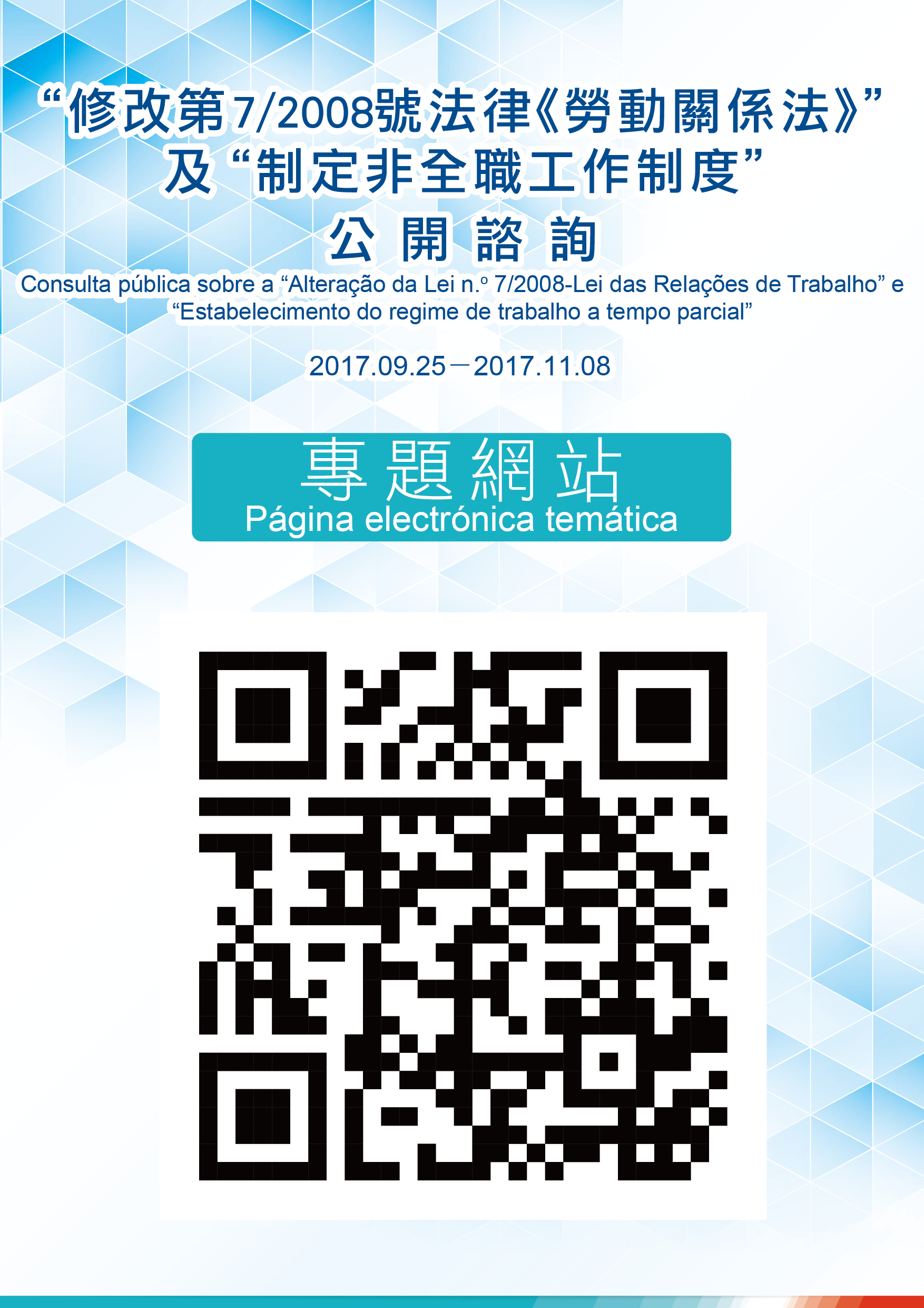 Os cidadãos ainda podem apresentar as suas opiniões através de email: labourlaw_parttime@dsal.gov.mo, telefone: 83999299, fax: 28581862 ou correio postal para Direcção dos Serviços para os Assuntos Laborais, Avenida do Dr. Francisco Vieira Machado nos 221-279, Edifício “Advance Plaza”, Macau. Também podem fazê-lo, digitalizando o código QR para entrar directamente na página temática da DSAL.