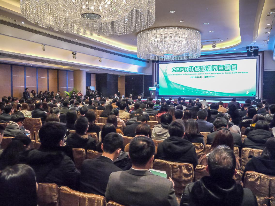 Participaram na Sessão cerca de 300 representantes oriundos de serviços públicos, associações comerciais e sectores industrial e comercial. Na primeira parte, os representantes da Direcção dos Serviços de Economia e do Ministério do Comércio apresentaram, respectivamente, o balanço da implementação do Acordo CEPA e o conteúdo dos dois respectivos Acordos. Na segunda parte, foram realizadas discussões temáticas, em grupo, conforme os sectores, os três temas são: cooperação na área financeira, cooperação nos domínios de convenções e exposições, e supervisão da qualidade, inspecção e quarentena.