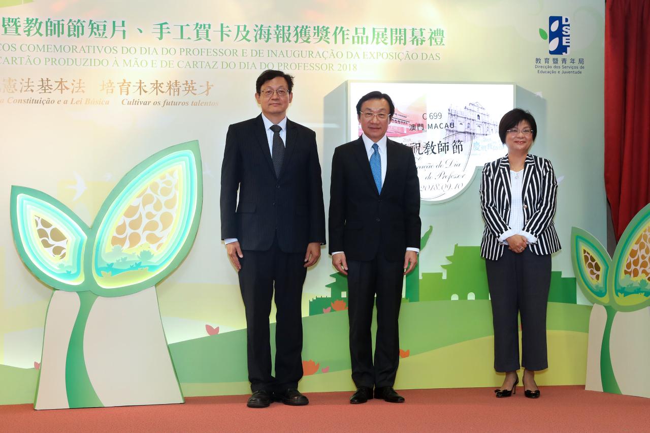 A Direcção dos Serviços de Educação e Juventude (DSEJ) e a Direcção dos Serviços de Correios e Telecomunicações colaboraram, continuamente, este ano, na emissão de produtos filatélicos comemorativos do Dia do Professor, tendo organizado, ainda, um concurso de design de vídeo, de cartão produzido à mão e de cartaz do Dia do Professor, como iniciativas importantes para celebrar este dia. Assim, na manhã do dia 10 de Setembro realizou-se, no Salão de Conferências Confúcio da DSEJ, a Cerimónia de Emissão dos Produtos Filatélicos Comemorativos 2018 e, depois, na Galeria Zizhan do Centro de Recursos Educativos (CRE), a Cerimónia de Inauguração da Exposição das Obras Premiadas de Design de Vídeo, de Cartão Produzido à Mão e de Cartaz do Dia do Professor 2018. As cerimónias contaram com a presença dos seguintes convidados: Alexis, Tam Chon Weng, Secretário para os Assuntos Sociais e Cultura, Lou Pak Sang, director da DSEJ, Lau Wai Meng, directora da Direcção dos Serviços de Correios e Telecomunicações, Xu Ting, chefe do Departamento de Educação e Assuntos de Juventude do Gabinete de Ligação do Governo Popular Central na RAEM, Leong Vai Kei e Kong Chi Meng, subdirectores da DSEJ, Ho Sio Kam, presidente da Associação de Educação de Macau, Chow Pak Fai, presidente da Associação das Escolas Católicas de Macau, Lo Yuk Ling, vice-presidente da Assembleia Geral da Associação Educativa da Função Pública de Macau, Chan Kai Chon, director do Museu de Arte de Macau, membros do Fundo de Desenvolvimento Educativo, do Conselho de Educação para o Ensino Não Superior, do Conselho de Juventude, do Conselho Profissional do Pessoal Docente e do Grupo Coordenador e Consultivo dos Trabalhos dos Cursos de Formação do Pessoal Docente, Professores Distintos do ano escolar de 2016/2017 e representantes das escolas, entre outros.