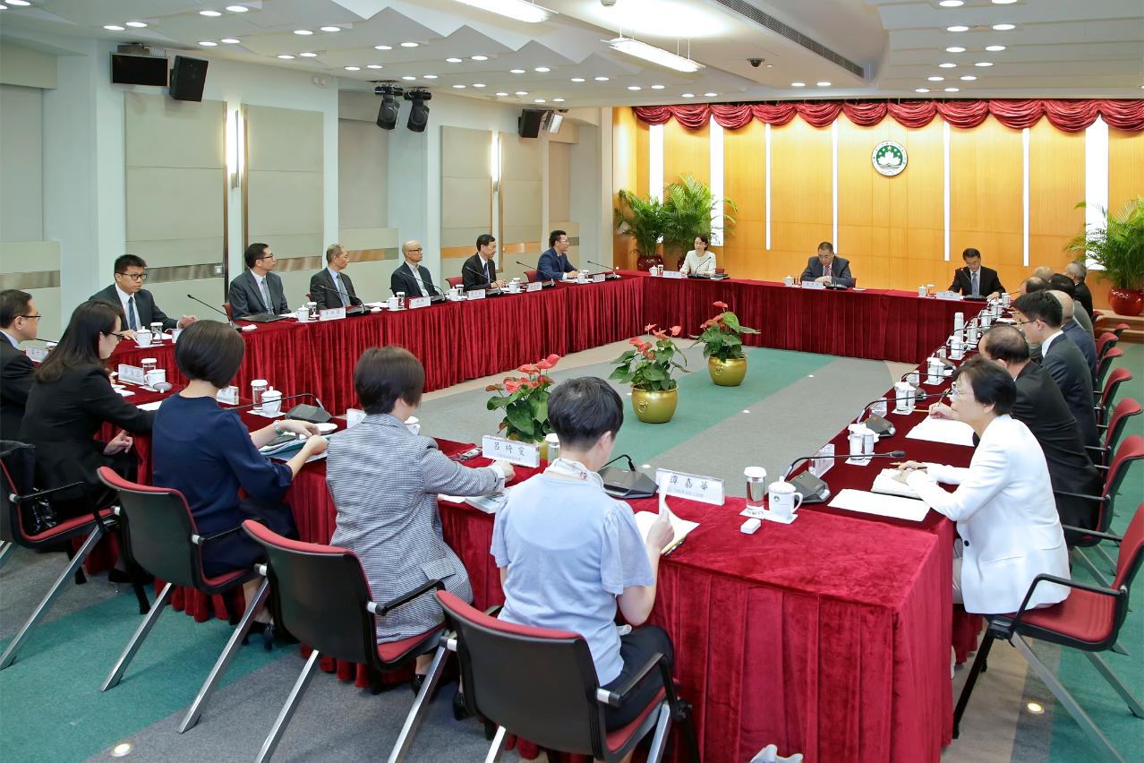 O Chefe do Executivo, Chui Sai On, reuniu-se, hoje (15 de Outubro), na Sede Governo, com os representantes da Associação Económica de Macau e do Centro de Pesquisa Estratégica para o Desenvolvimento de Macau, trocando impressões sobre o ambiente macroeconómico, a construção da Grande Baía Guangdong-Hong Kong-Macau e vários temas sociais e ligados ao quotidiano da população, no âmbito da elaboração das Linhas de Acção Governativa para o ano de 2019.