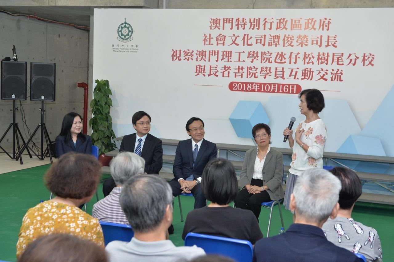Logo a seguir, o Doutor Alexis Tam teve um diálogo com alunos da ACS sobre vários temas, tais como, por exemplo, as instalações do campus e a educação para idosos. E os alunos apresentaram um sincero agradecimento ao Governo da RAEM, pela atenção prestada e investimento na área da educação para idosos, dando ainda as suas opiniões.