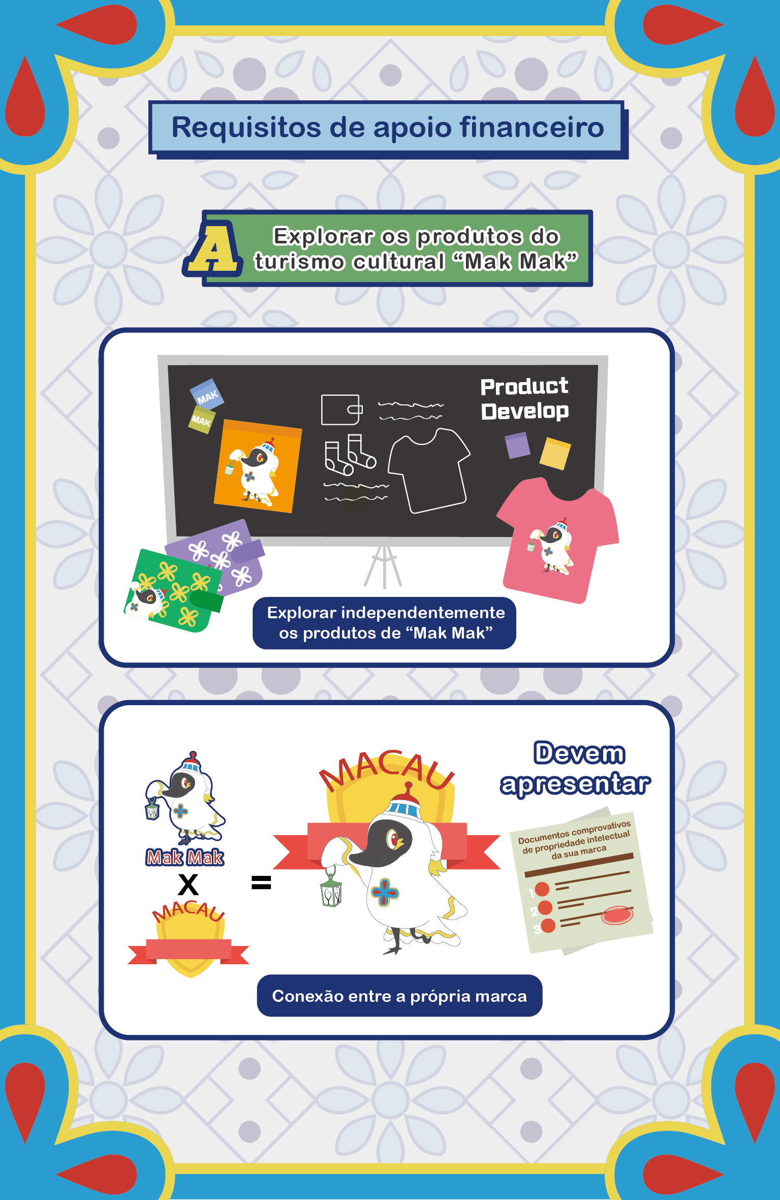 Ao explorar projecto de serviços de experiência de turismo cultural de Macau na utilização da mascote “Mak Mak”, o projecto deverá estar relacionado com os elementos culturais de Macau, tais como locais de património cultural, edifícios novos e antigos, cultura gastronómica, monumentos históricos nos bairros comunitários, criatividade cultural dos bairros comunitários, paisagens turísticas, património cultural intangível ou costumes festivos etc; o projecto deve conjugar elementos de exposições e espectáculos culturais ou de mídia digital, como animação, tecnologias digitais (como realidade aumentada de AR, realidade virtual de VR, realidade híbrida de MR) ou jogos interactivos, podendo ainda, utilizar a mascote turística “Mak Mak” para explorar produtos de turismo cultural. Recomenda-se que o projecto seja concluído através da cooperação de várias empresas, sendo uma das empresas o representante principal do projecto para apresentação da candidatura, podendo o candidato formar e integrar livremente o conteúdo dos serviços caracterizados de experiências de turismo cultural a serem explorados.