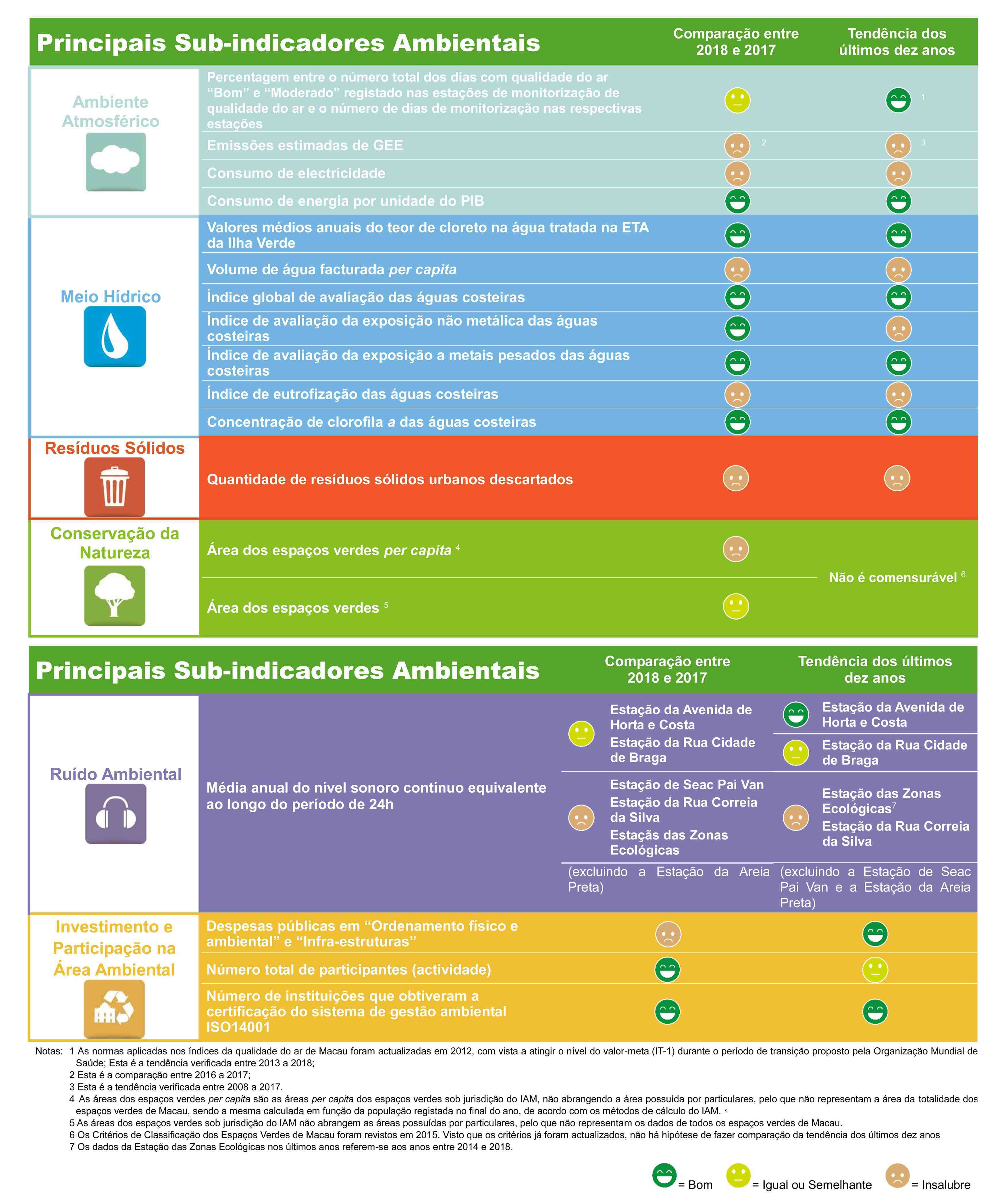 No que diz respeito ao ambiente atmosférico, os registos de todas as estações de monitorização de qualidade do ar em 2018 revelaram que o número total de dias com qualidade do ar de “Bom” e “Moderado” ultrapassou os 92% do número total de dias de monitorização das respectivas estações, sendo semelhante a 2017. Em 2018, o O3 foi o principal poluente atmosférico de Macau e a concentração média anual de SO2 e CO diminuiu em todas as estações, comparando com 2017. No entanto, devido à emissão de gases de escape e à produção de electricidade local, entre outros factores, a concentração média anual de NO2 na Estação da Berma da Estrada (Macau) e na Estação das Áreas de Alta Densidade Habitacional (Macau) foi superior ao valor padrão em 2018. Ao mesmo tempo, as concentrações médias anuais de PM10 e PM2,5 foram inferiores aos valores padrões e corresponderam à tendência global da Rede de Monitorização da Qualidade do Ar da Região do Delta do Rio das Pérolas (Guangdong - Hong Kong - Macau).