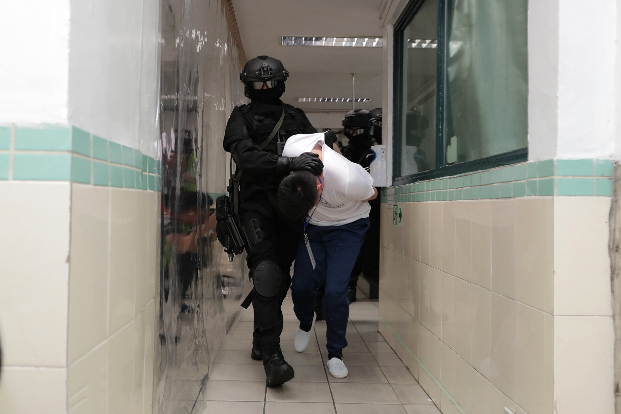 Ao mesmo tempo, a Unidade Especial de Polícia e o Grupo Cinotécnico do CPSP, a Equipa Anti-motim do EPC e os agentes dos CB, com recurso a escudos tácticos, granada sónica e pulverizador de pimenta, entraram à força na cela e detiveram imediatamente os reclusos em resistência, conseguindo reprimir o tumulto, bem como resgataram 4 reclusos feitos de reféns, dos quais um ferido foi conduzido ao hospital.