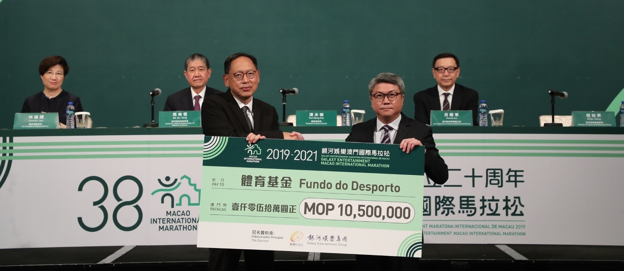 A Comissão Organizadora anunciou nesta conferência de imprensa que o Galaxy Entertainment Group irá ser o patrocinador principal da “Maratona Internacional de Macau” de 2019 a 2021, e é considerada o Galaxy Entertainment Group a ser o décimo oitavo ano consecutivo como patrocinador principal do Evento. O Instituto do Desporto e o Galaxy Entertainment Group, representados pelo Presidente do Instituto do Desporto Pun Weng Kun e pelo Director do Galaxy Entertainment Group Philip Cheng, respectivamente, celebraram o acordo de patrocínio principal da Maratona Internacional de Macau de 2019 a 2021. Na contrapartida da celebração do acordo, o GEG patrocina o evento com um montante total de 10,5 milhões de patacas atribuídas para três anos. Os convidados presentes na conferência de imprensa incluíram: Presidente da Associação Geral de Atletismo de Macau, Ma Iao Hang, Vice-Presidente do Galaxy Entertainment Group, Francis Lui Yiu Tung, Vice-Presidente do Instituto do Desporto, Lam Lin Kio e membros do Conselho do Desporto.
