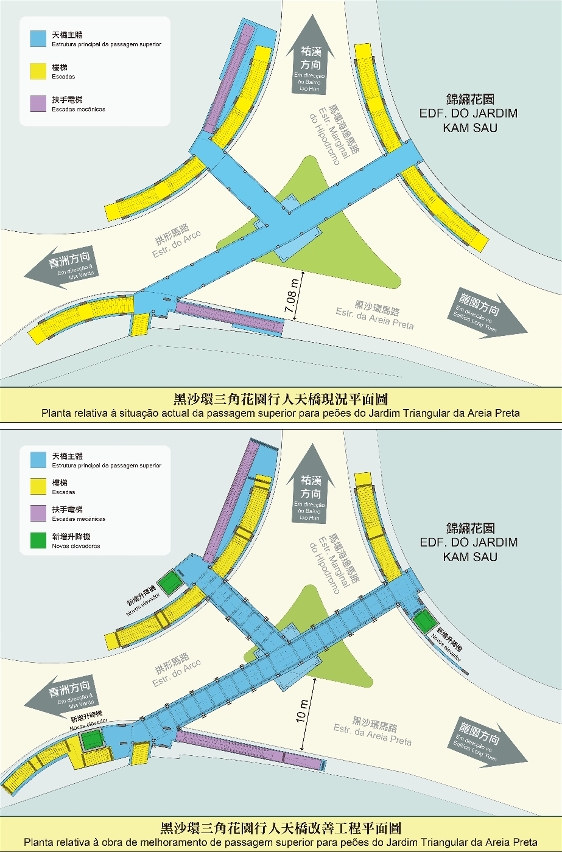 A “passagem superior para peões do Jardim Triangular da Areia Preta” situa-se na intersecção entre a Estrada Marginal do Hipódromo e a Estrada da Areia Preta, na Península de Macau, e os seus três acessos de entrada e saída localizam-se em frente do Ki Kuan Bairro, do Edifício Villa Bela e do Edifício Novo Macau Centro. Devido ao limite do espaço, dever-se-á reformular a estrutura da passagem existente e reordenar as suas escadas em conformidade com o ambiente actual de cada acesso de entrada e saída da passagem, no sentido de desocupar os espaços para instalação dos elevadores. Ao mesmo tempo, acrescentar-se-á uma faixa de rodagem nesta via, ou seja, este troço da Estrada da Areia Preta passa a ter três faixas de rodagem.