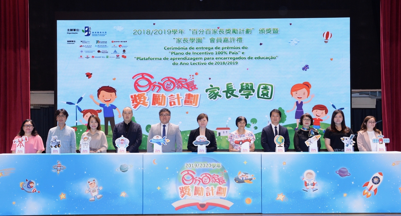 Para elogiar os encarregados de educação que participaram, no último ano, de forma entusiástica e positiva, nas actividades para a família e de educação parental, a DSEJ realizou a cerimónia de entrega de prémios do “Plano de Incentivo 100% Pais” e de louvores da “Plataforma de Aprendizagem para Encarregados de Educação” do ano lectivo de 2018/2019, bem como a cerimónia de lançamento do “Plano de Incentivo 100% Pais” do ano lectivo de 2019/2020, no dia 20 de Outubro, pelas 10h30, no auditório da Escola Luso-Chinesa Técnico-Profissional. As cerimónias contaram com a presença de vários convidados, nomeadamente, a Directora substituta da DSEJ, Leong Vai Kei, o Chefe do Departamento de Ensino, Kong Ngai, a Curadora do Museu das Comunicações da Direcção dos Serviços de Correios e Telecomunicações, Wong Kam Ian, e o chefe do Departamento de Exibições e de Educação do Centro de Ciência de Macau, Leong Si Chong, além de mais 60 representantes de instituições educativas e associações.