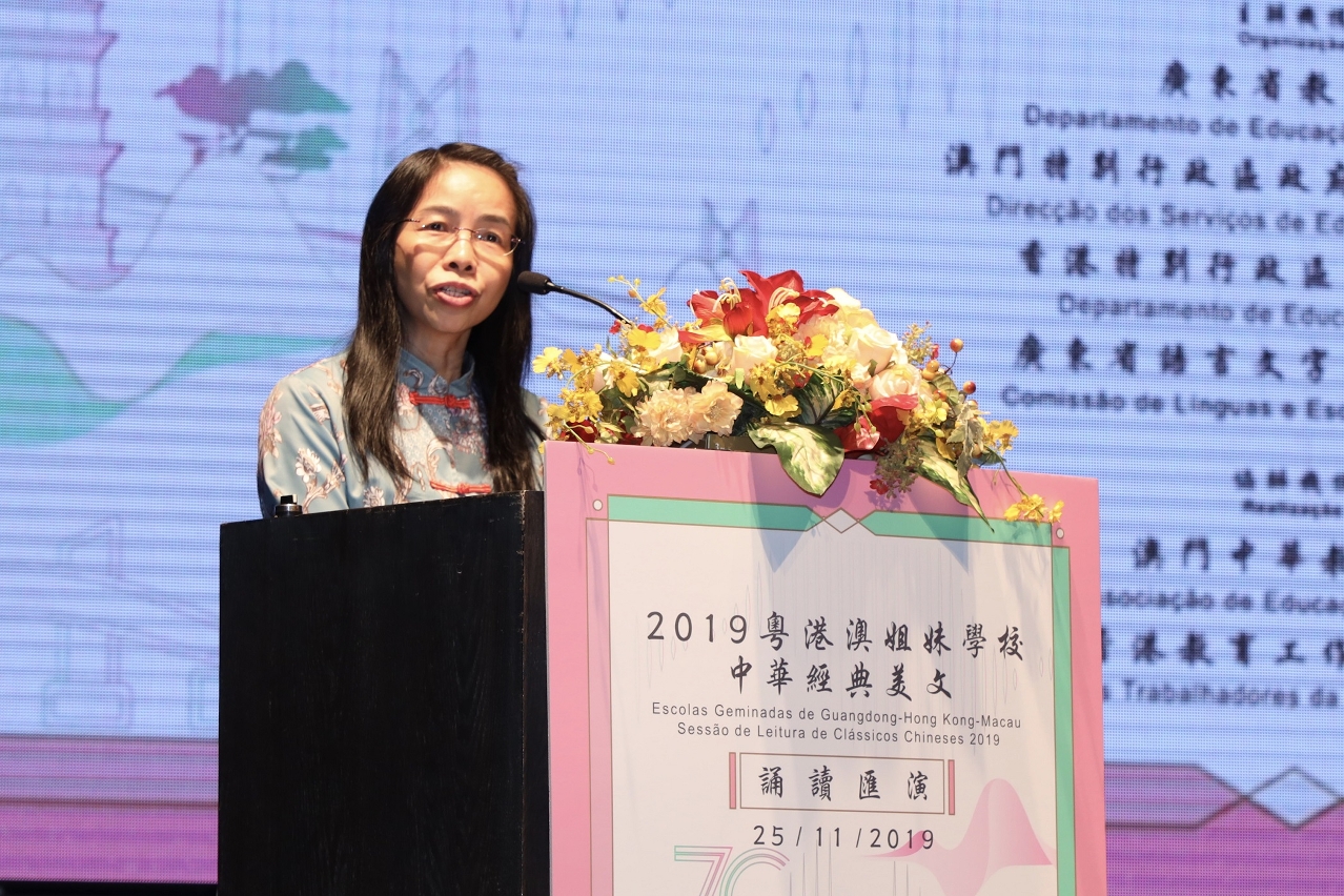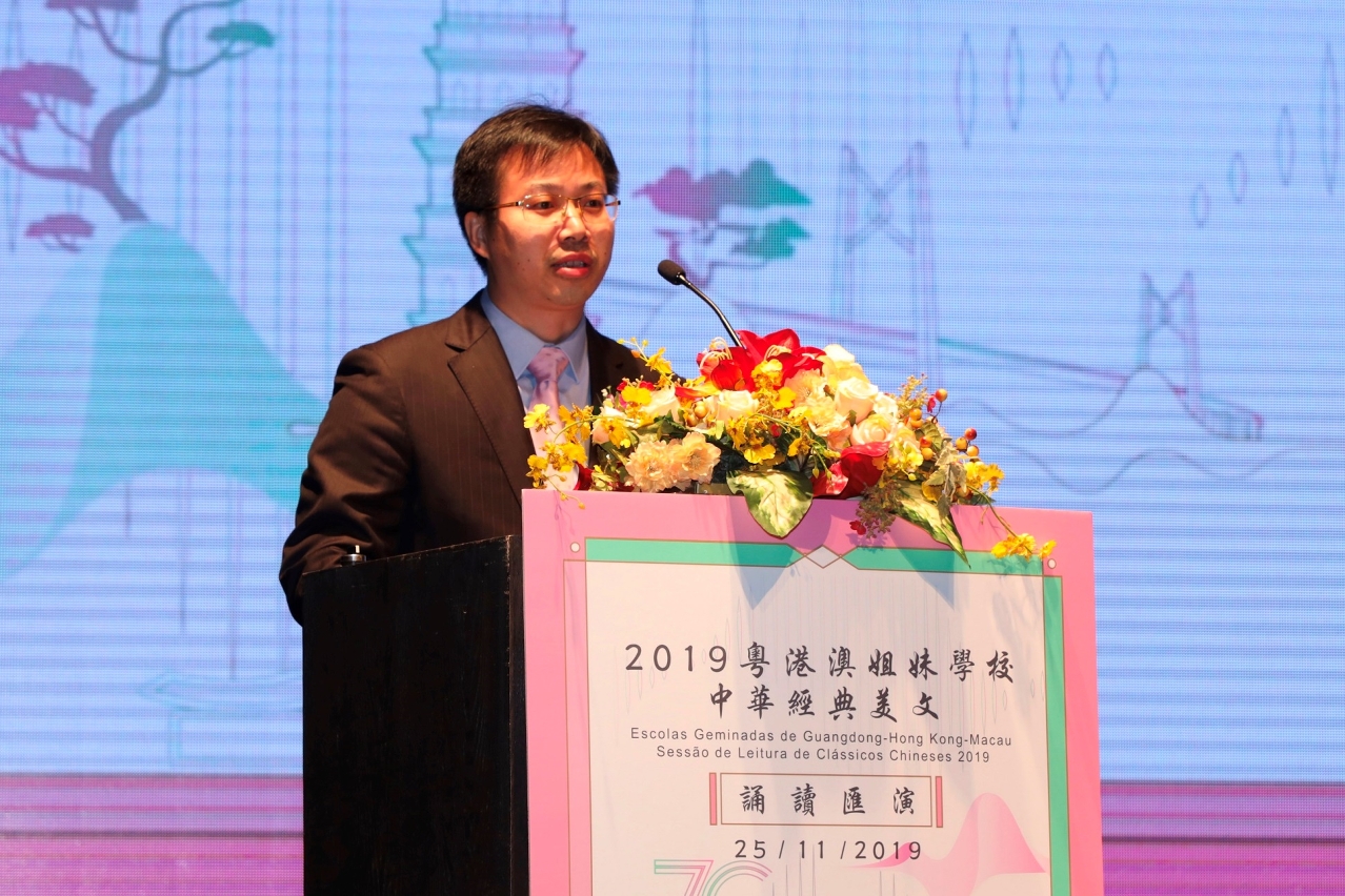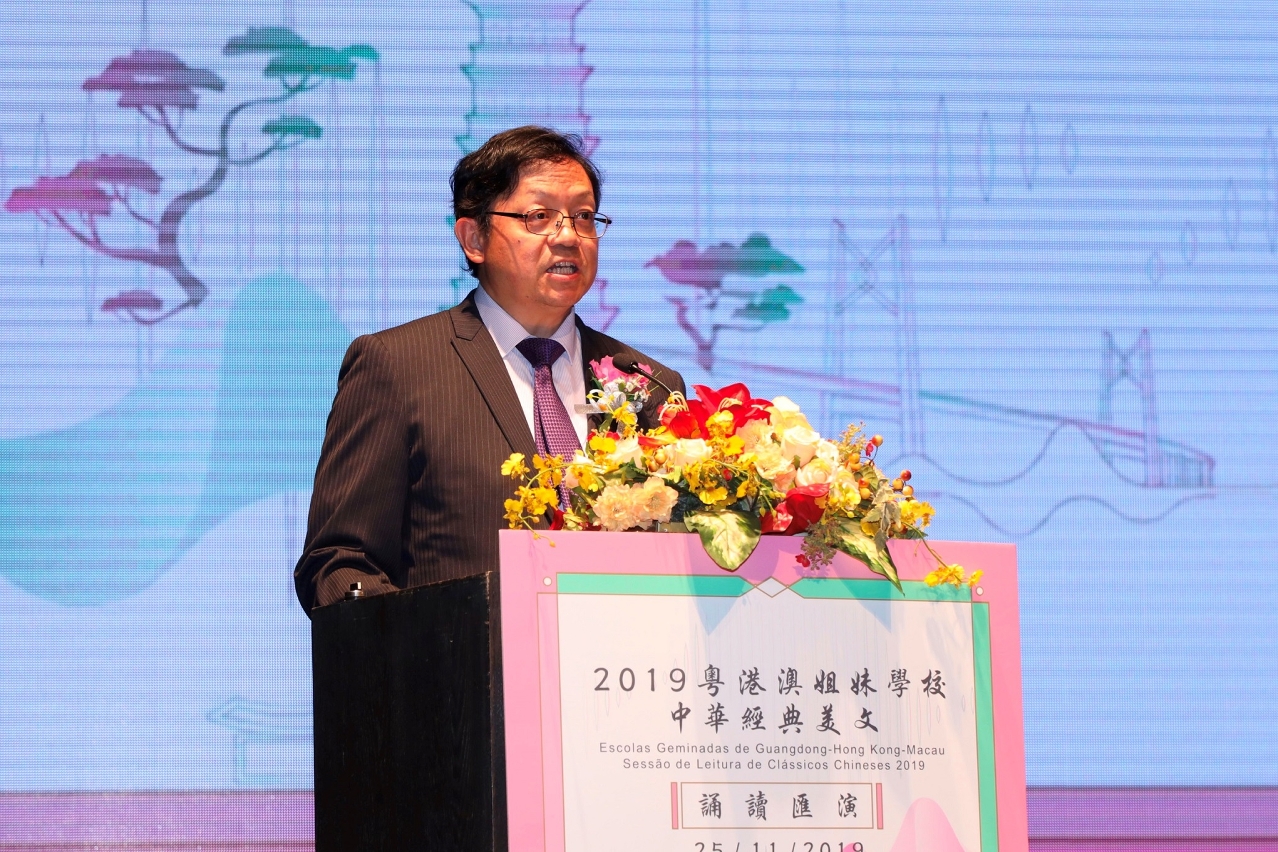 Com o intuito de celebrar o 20.º Aniversário do Retorno de Macau à Pátria, incentivar o intercâmbio e a cooperação na área da Grande Baía Guangdong-Hong Kong-Macau nos âmbitos educativo, linguístico e literário, aprofundar o conhecimento da longa História da Pátria e promover a cultura chinesa, o Departamento de Educação de Guangdong, a Direcção dos Serviços de Educação e Juventude de Macau, o Departamento de Educação da Região Administrativa Especial de Hong Kong e o Comité de Línguas e Escrita de Guangdong organizaram, em parceria, a Sessão de Leitura de Clássicos Chineses 2019 das Escolas Geminadas de Guangdong-Hong Kong-Macau, que contou, ainda, com a colaboração da Associação de Educação de Macau e da Federação dos Trabalhadores da Educação de Hong Kong. A sessão, que teve lugar no dia 25 de Novembro de 2019 (segunda-feira), no Auditório da Escola São Paulo, foi concluída com êxito, e contou com a presença dos seguintes convidados: