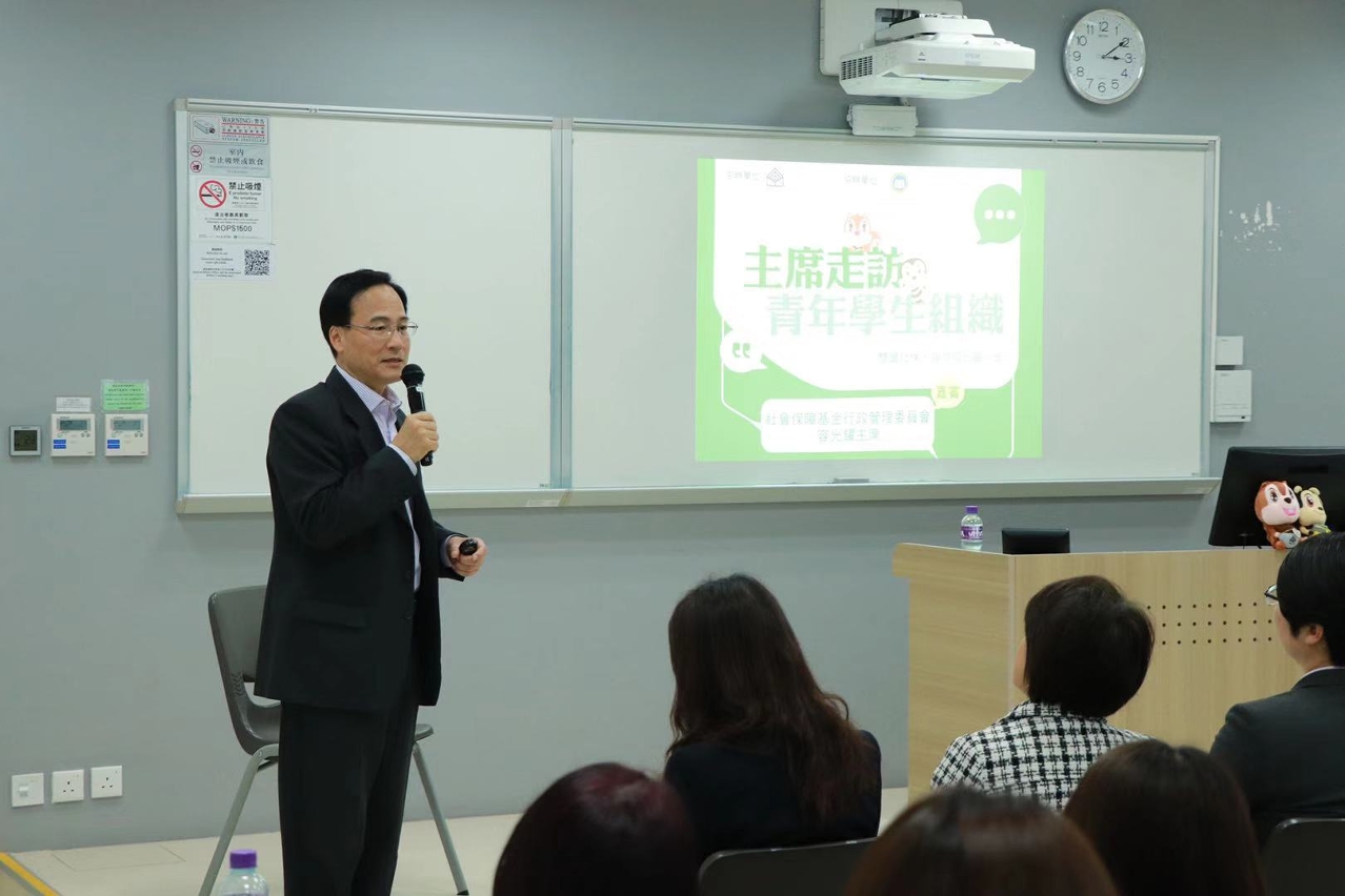 O Presidente, Iong Kong Io, apresentou, em primeiro lugar, a tendência de envelhecimento demográfico da sociedade de Macau, prevendo que os idosos de Macau com idade igual ou superior a 65 anos no próximo ano tenham uma percentagem de 14,2 relativamente à população local, até ao ano 2036, a percentagem aumentará para 24,7, ou seja, haverá um idoso em cada 4 pessoas. Desta forma, para fazer face ao envelhecimento demográfico e ajudar os residentes a prepararem-se melhor para a aposentação, o Governo da RAEM constituiu o regime de segurança social de dois níveis, isto é, através do regime da segurança social do 1.o nível, recebem-se as contribuições fixas e atribuem-se prestações fixas, de modo a providenciar um nível de protecção básico na velhice aos residentes, enquanto no regime de previdência central não obrigatório de 2.o nível em que os empregadores e trabalhadores ou indivíduos participam nos planos contributivos de previdência, procede-se à poupança e investimento e acumula-se riqueza, no sentido de permitir uma vida pós-aposentação com melhores condições. O Dr. Iong Kong Io incentivou os jovens a fazer bom uso dos recursos e política de segurança social. No futuro, quando ingressarem no mercado de trabalho ou iniciarem um negócio, devem prestar mais atenção aos seus direitos e deveres de segurança social, podendo ainda através de participarem no regime de previdência central não obrigatório acumular antecipadamente uma poupança para a vida pós-aposentação.